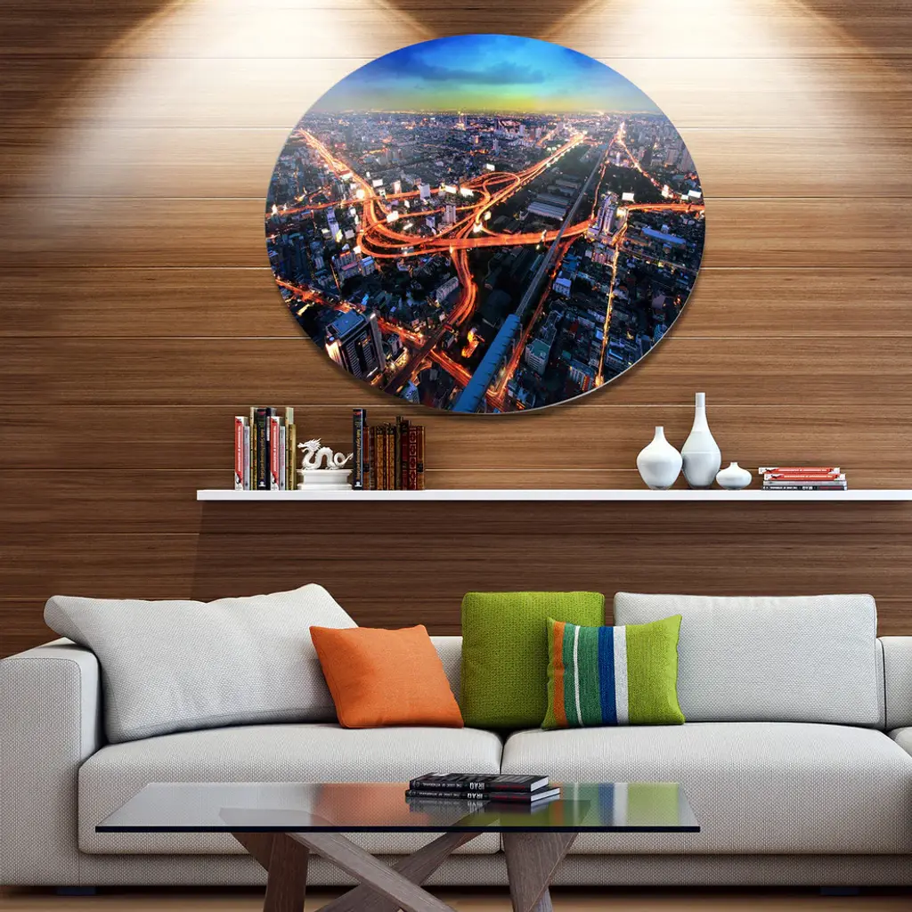 Bring Contemporary Abstraction to your home with this large Circle Metal wall art. This Bangkok Expressway Aerial View Metal Artwork makes it the focal point of any room or office. - White Gloss Coating ensures colors are extra vibrant with light reflection.- Aluminum grade Sheet Metal with 1 inch mounting frame on the back giving the illusion that the artwork is floating on the wall..- Mounting Brackets are included along with instructions.- High Quality Digital images are created directly into a glossy aluminum panel producing a stunning and captivating print into the glossy finish of the metal.- Water, Fire and Scratch resistant HD Aluminum panels.- Looks better than any photo paper and guaranteed to last at least 20 years- Easy to clean with a microfiber cloth. Colors are far superior to regular Canvas Art. - Easy to Hang