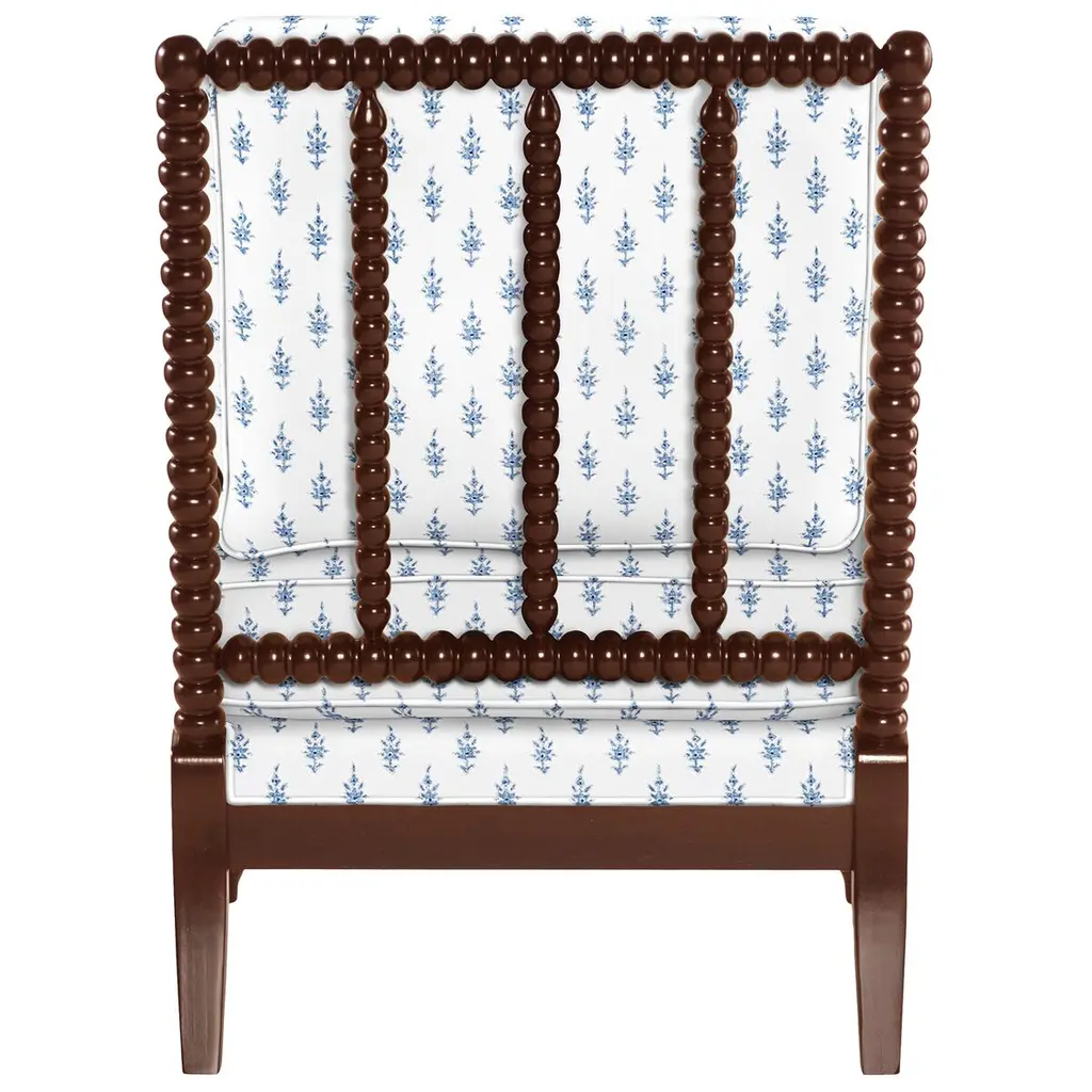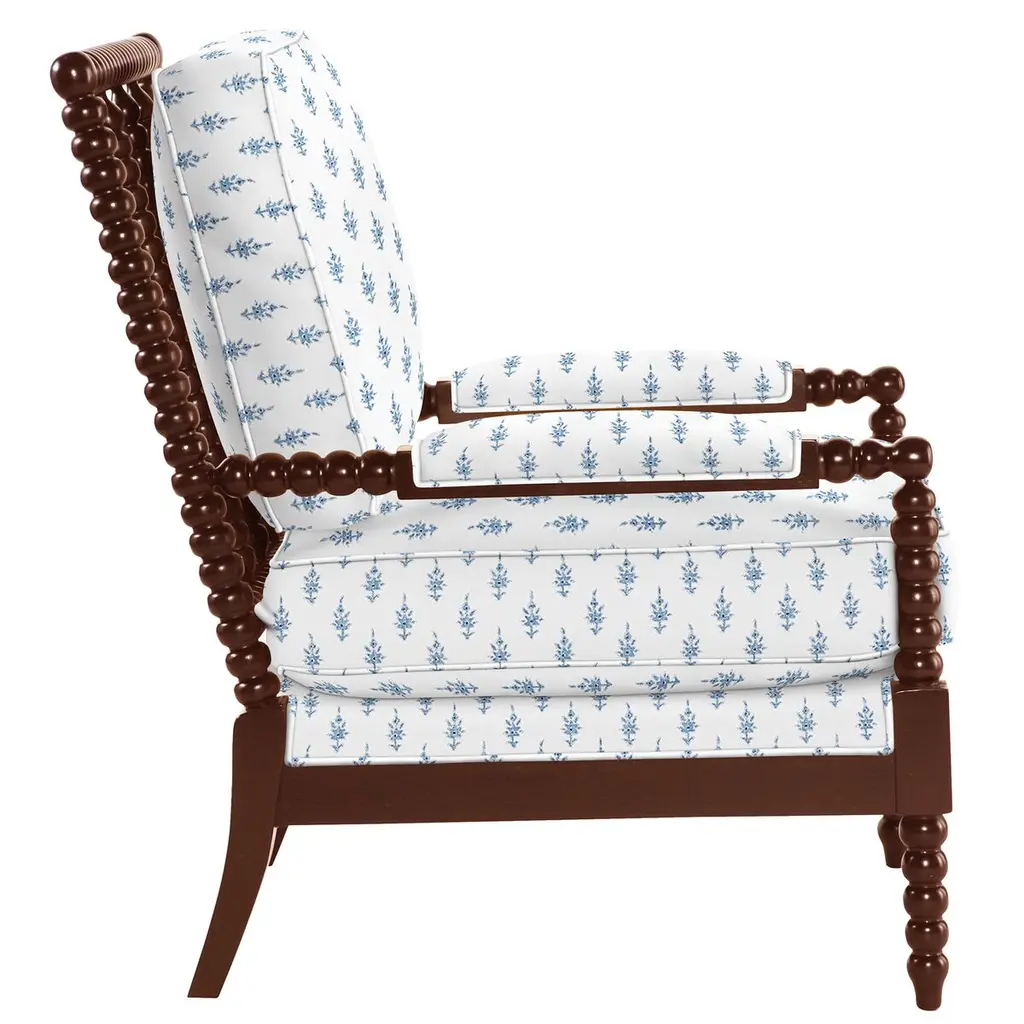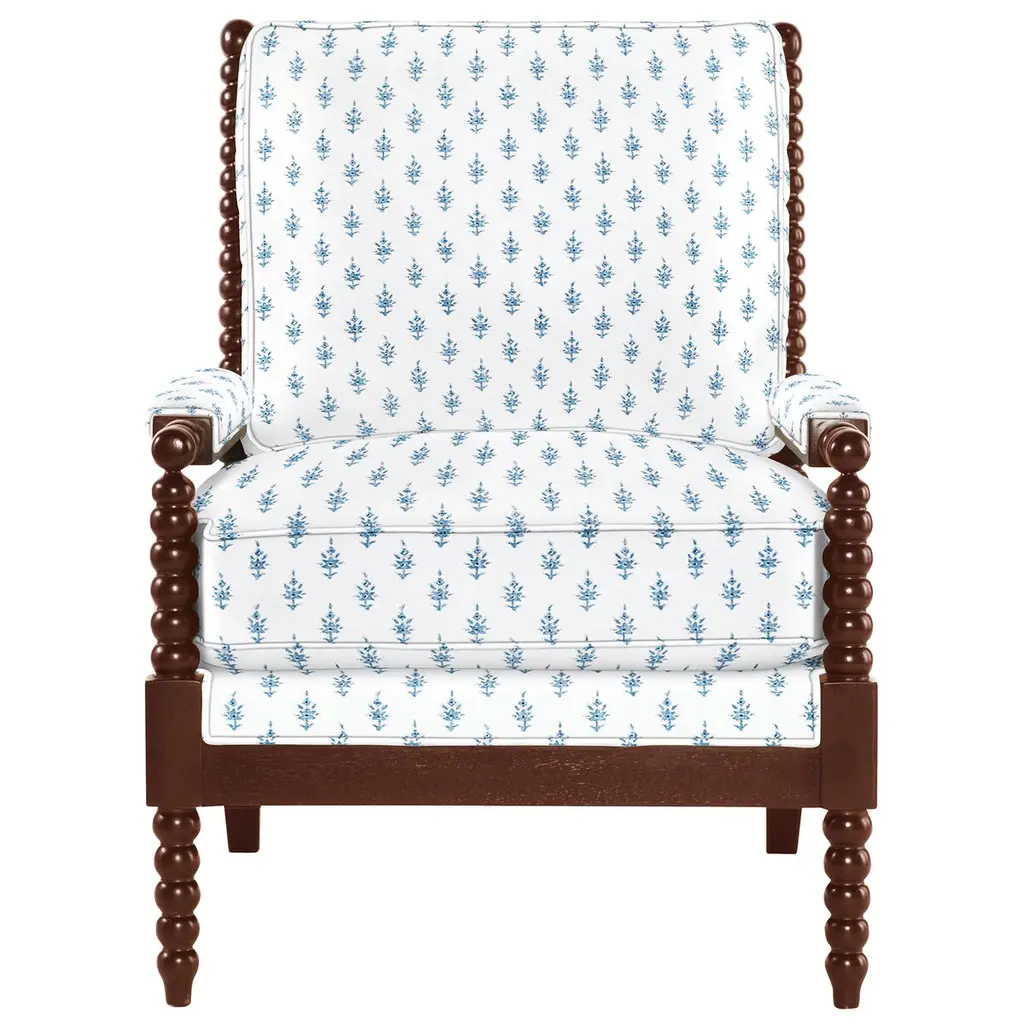 Exclusive to One Kings Lane: This classic accent chair features spindles throughout the design with upholstered top arm panels. It is upholstered in a block print featuring a soft blue color palette. Constructed of solid hard wood, Pirell Webbed suspension system, and a spring foam cushion wrapped in polyester fibers with down-proof ticking ensure long-lasting comfort and support. Each piece is handcrafted by skilled artisans in High Point, NC and offers a lifetime warranty on the frame and suspension system and a limited lifetime warranty on the seat cushion.