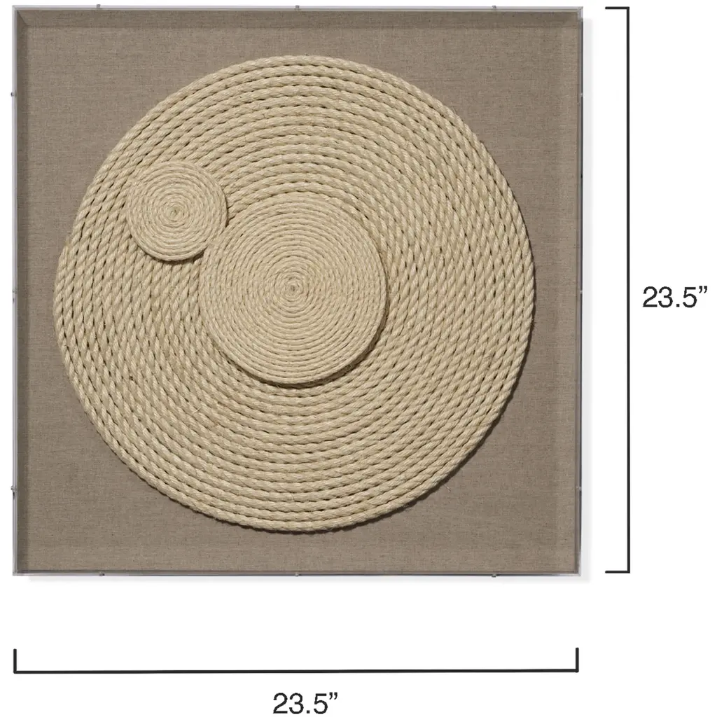 Coastal meets contemporary in this wall art piece formed with layered circles of spiraling rope on a linen backing. The twisted texture of the rope adds further dimension to the spiraling circles as they are layered upon each other; this and the simple shapes and color palette are designed to complement a variety of decor styles. Designed for today's casual and comfortable home, this wall art is handcrafted out of natural rope and covered with an acrylic shadowbox. Arranged by hand with natural materials, each piece is a unique work of art.