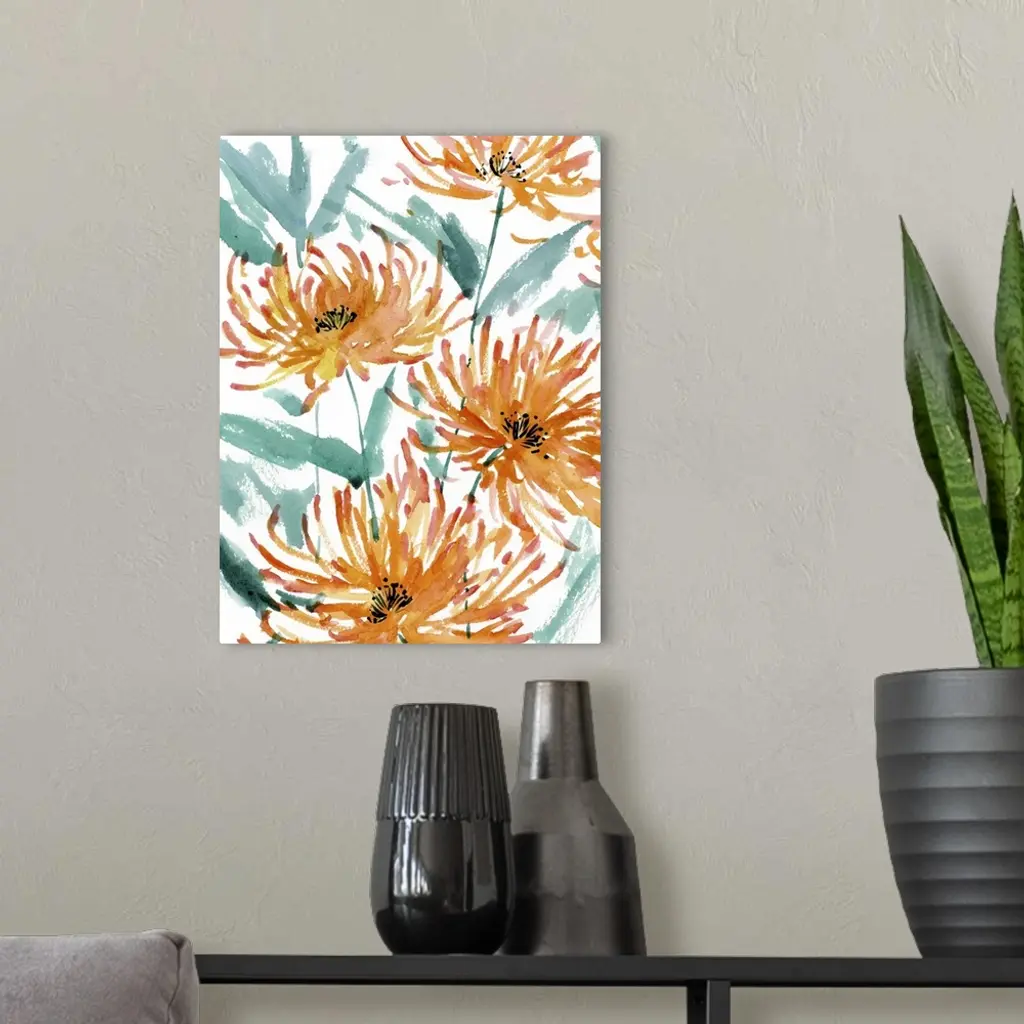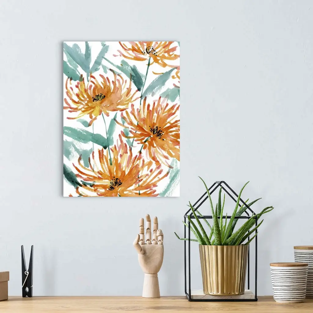 Contemporary watercolor painting of orange, red, and yellow flowers with blue-green leaves on a white background.