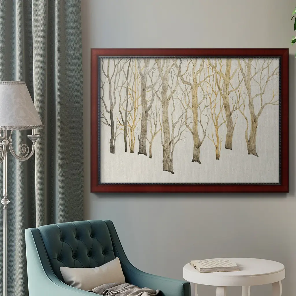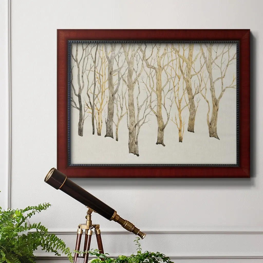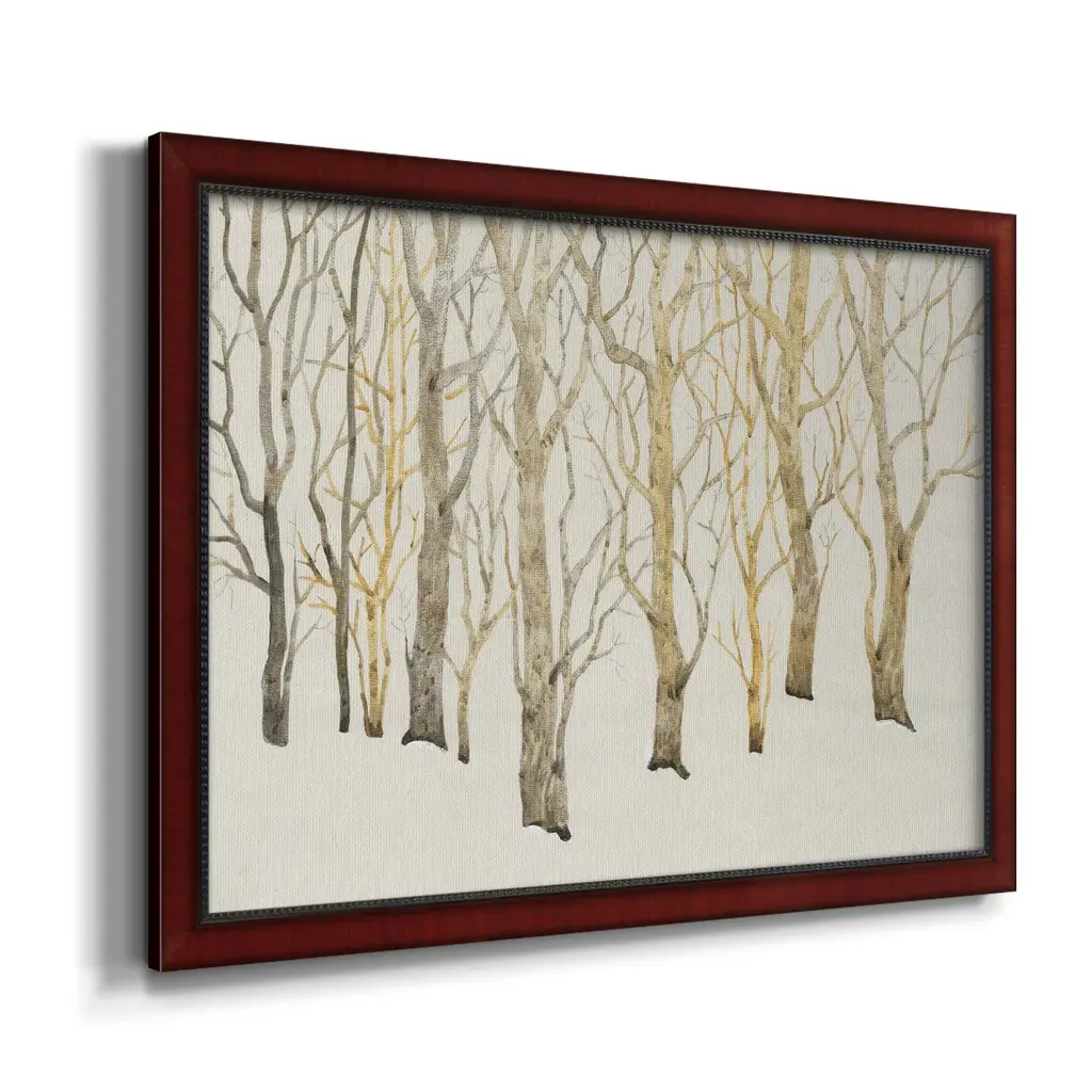 Bare Trees I Premium Framed Canvas- Ready to Hang A Premium Framed Canvas created to last. Framed in distressed wood and available in an array of sizes and colors Featuring a beveled a solid wood stretcher bar, each piece comes ready to hand 3 SIZES AVAILABLE 16''X20'' - Overall Size 18'X27'' - Overall Size 24''x36'' - Overall Size Each piece is made to order. Each piece comes with hanging hardware. Made in the USA Ready to Hang Giclee Paper Print Acrylic Glass Beveled Matt Board