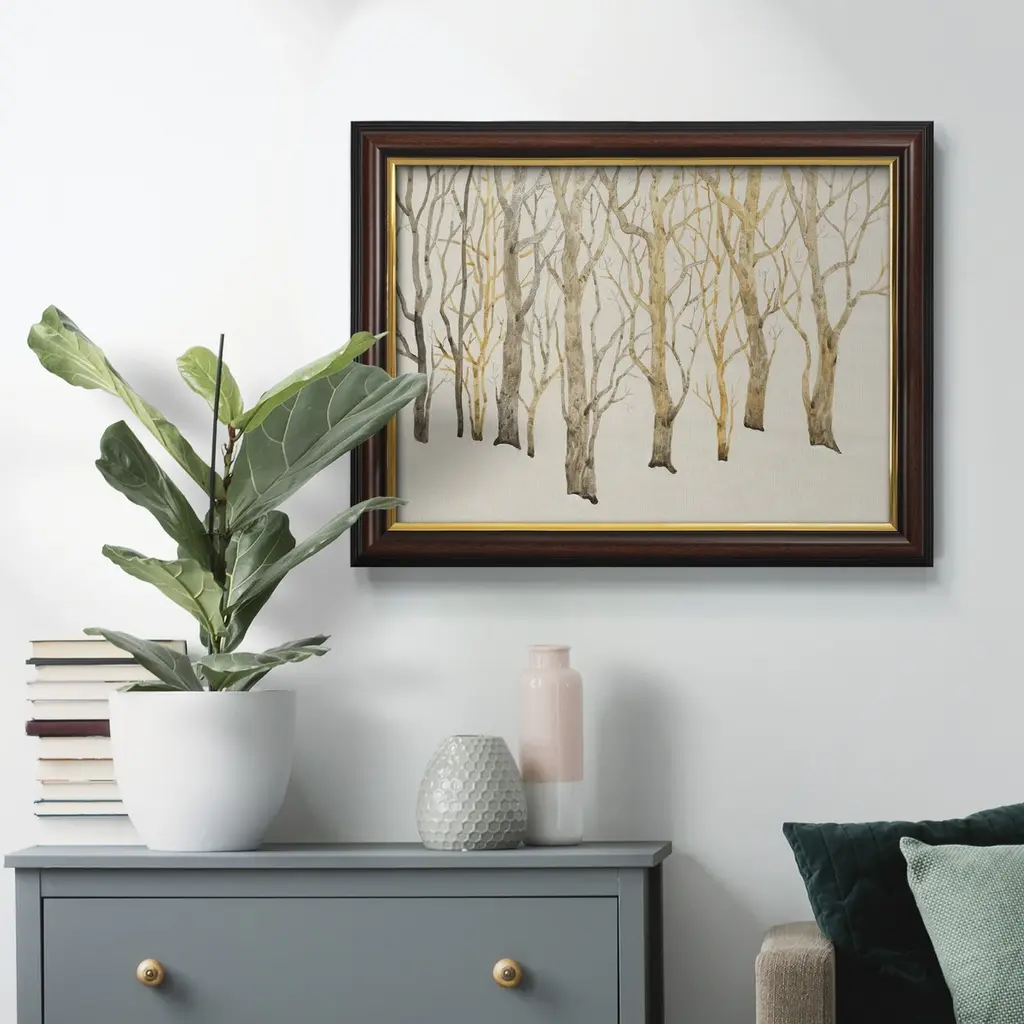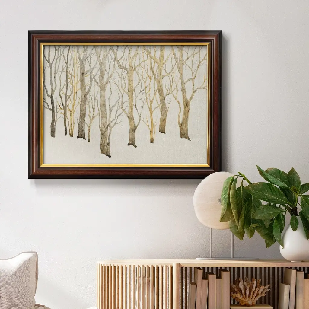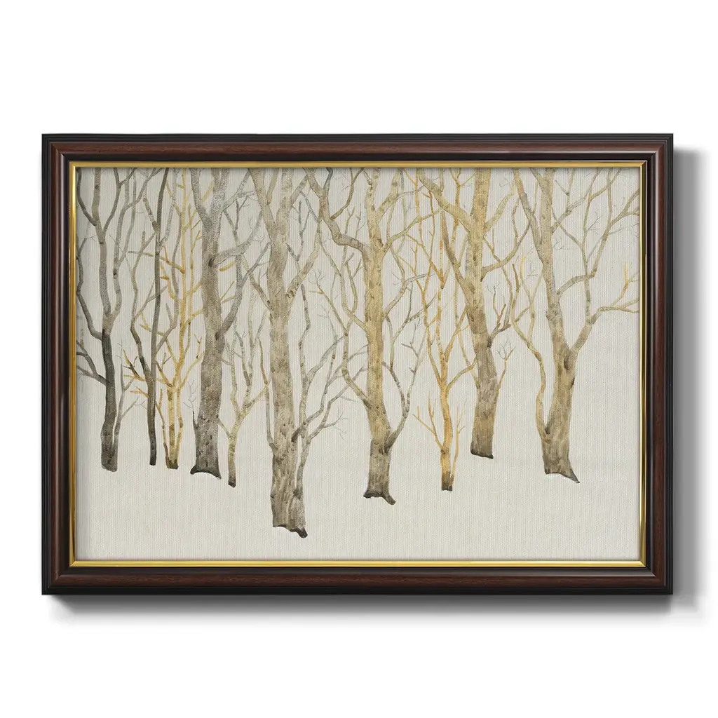 Bare Trees I Premium Framed Canvas- Ready to Hang A Premium Framed Canvas created to last. Framed in distressed wood and available in an array of sizes and colors Featuring a beveled a solid wood stretcher bar, each piece comes ready to hand 3 SIZES AVAILABLE 16''X20'' - Overall Size 18'X27'' - Overall Size 24''x36'' - Overall Size Each piece is made to order. Each piece comes with hanging hardware. Made in the USA Ready to Hang Giclee Paper Print Acrylic Glass Beveled Matt Board