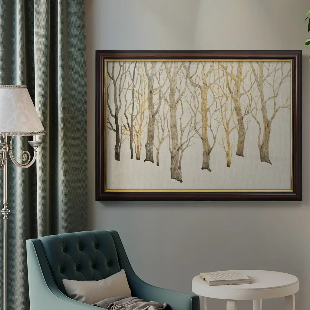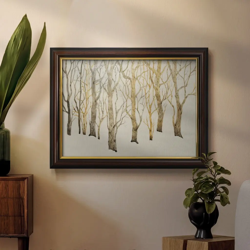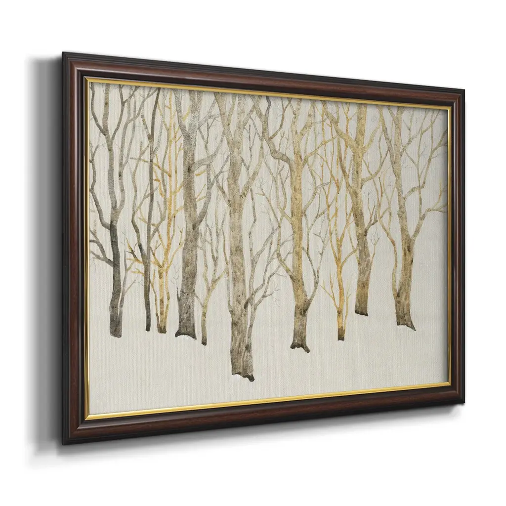 Bare Trees I Premium Framed Canvas- Ready to Hang A Premium Framed Canvas created to last. Framed in distressed wood and available in an array of sizes and colors Featuring a beveled a solid wood stretcher bar, each piece comes ready to hand 3 SIZES AVAILABLE 16''X20'' - Overall Size 18'X27'' - Overall Size 24''x36'' - Overall Size Each piece is made to order. Each piece comes with hanging hardware. Made in the USA Ready to Hang Giclee Paper Print Acrylic Glass Beveled Matt Board
