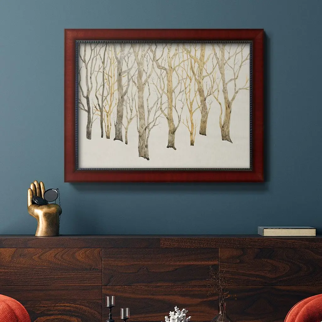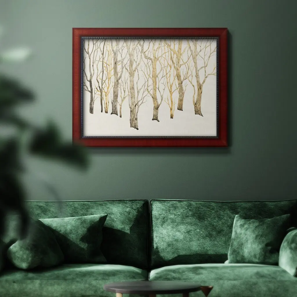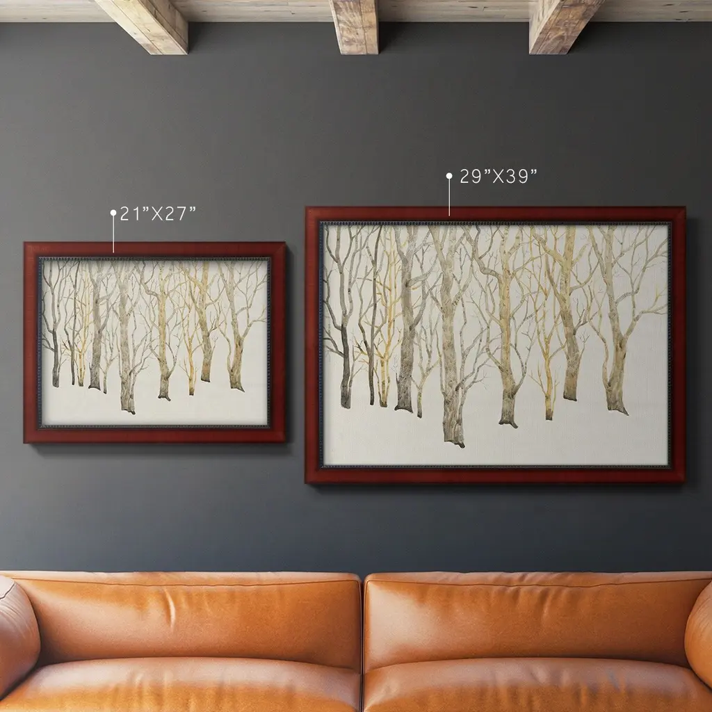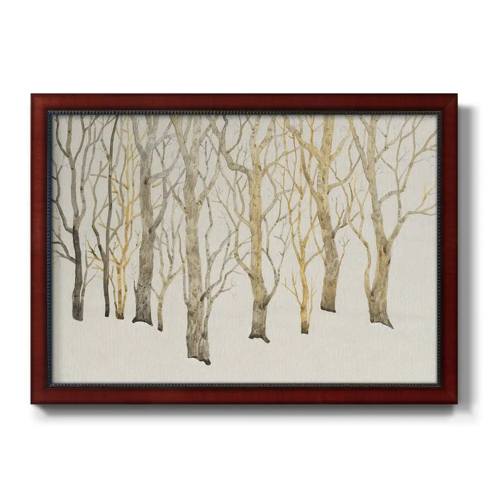 Bare Trees I Premium Framed Canvas- Ready to Hang A Premium Framed Canvas created to last. Framed in distressed wood and available in an array of sizes and colors Featuring a beveled a solid wood stretcher bar, each piece comes ready to hand 3 SIZES AVAILABLE 16''X20'' - Overall Size 18'X27'' - Overall Size 24''x36'' - Overall Size Each piece is made to order. Each piece comes with hanging hardware. Made in the USA Ready to Hang Giclee Paper Print Acrylic Glass Beveled Matt Board