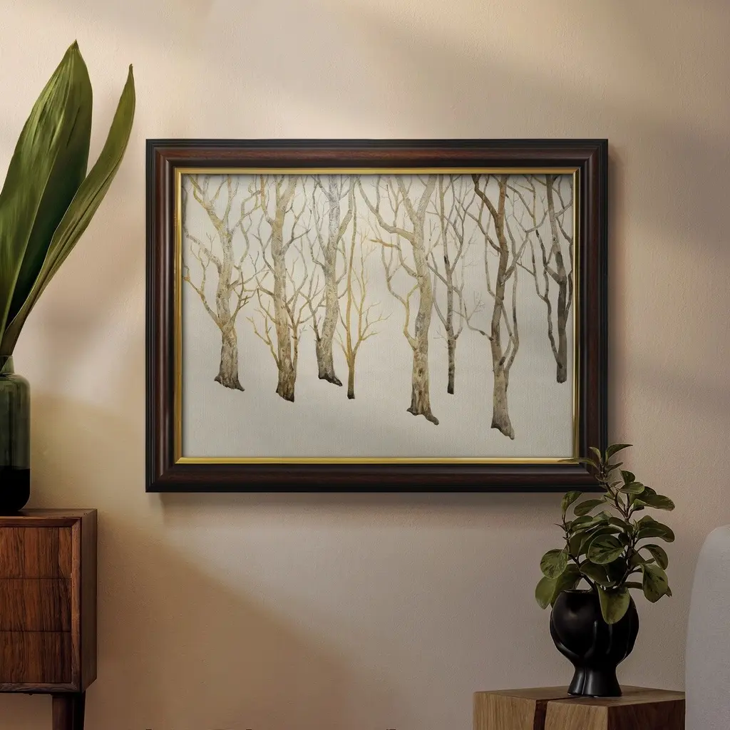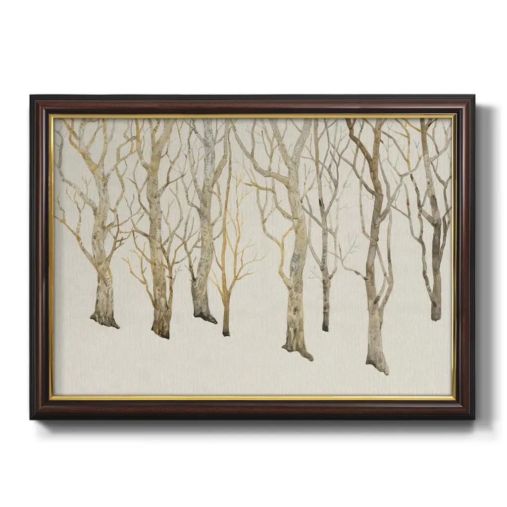 Bare Trees II Premium Framed Canvas- Ready to Hang A Premium Framed Canvas created to last. Framed in distressed wood and available in an array of sizes and colors Featuring a beveled a solid wood stretcher bar, each piece comes ready to hand 3 SIZES AVAILABLE 16''X20'' - Overall Size 18'X27'' - Overall Size 24''x36'' - Overall Size Each piece is made to order. Each piece comes with hanging hardware. Made in the USA Ready to Hang Giclee Paper Print Acrylic Glass Beveled Matt Board