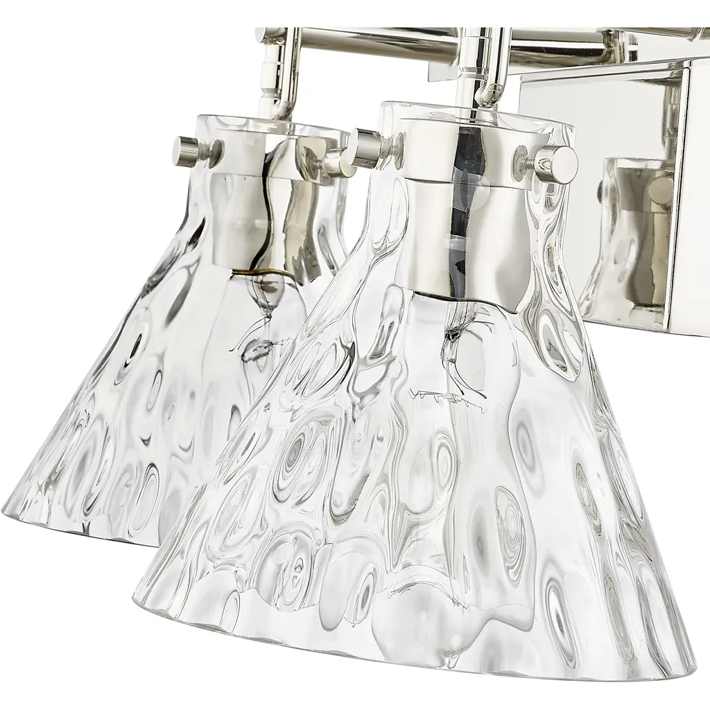 The Barlon Collection of vanity and pendant lighting provides a unique touch of style with artfully flared, clear water glass shades. The fixtures are a modern take on classic hook-style lantern lighting and are available in matte black, polished nickel, vintage brass, or modern gold with 1-light, 2-light, and 3-light options. This collection is the perfect look for a modern farmhouse or industrial-style loft.