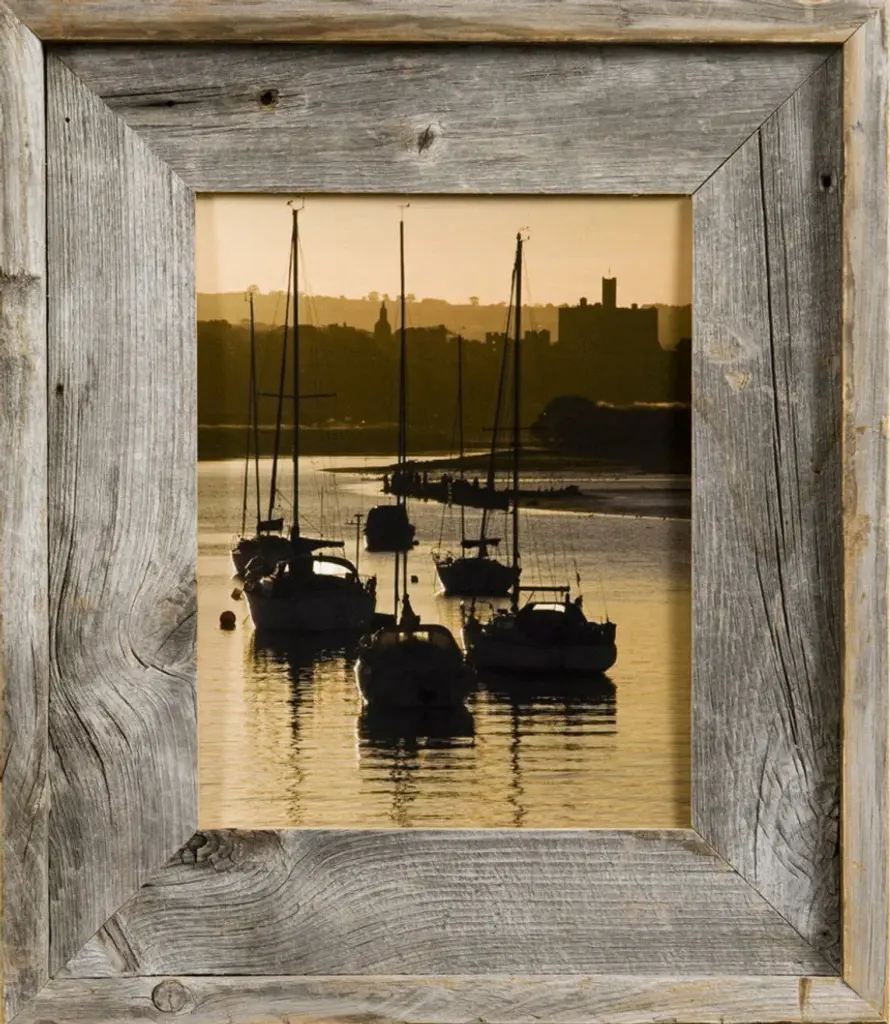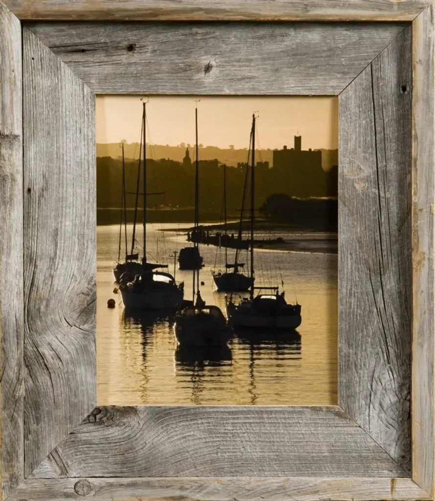 *PLEASE NOTE - Glass is included with frame sizes 16x20 or smaller. Larger sizes do not include glass due to the high risk of breakage in shipping.Barnwood Picture Frames are perfect for your favorite photograph of the beach at sunset. These beautiful frames made from authentic reclaimed wood have a 2.25-inch-wide frame face surrounded by a 1/2 inch barnwood border. The result is that you get a beautiful matted portrait without the expense of a matte. Each of our barnwood picture frames is crafted from authentic barn woodThis frame is a favorite for our nautical decor lovers. A grouping of these barnwood picture frames in several sizes look great as wall hangings in your beach-themed bathroom. Remove the glass, and use one of our square frames (5x5, 6x6 or 8x8) to frame seashells, sand dollars, or other beach treasures.If nautical bath decor isn't a priority, this frame looks beautiful with a variety of subjects. Frame an oil painting of a riverbed flanked by trees filled with autumn leaves. Purchase several frames of the same size and create your own portrait collage. Frame a treasured Birthday Card. Whatever the season, whatever the subject, a rustic barnwood frame is a beautiful way to highlight your favorite artistic pieces.Rustic picture frames are increasing in popularity, due to the fact that they represent the ultimate in "green" decor. Crafted from 100% reclaimed barnwood, the Lighthouse Series Frames feature clean lines and neutral tones that push them beyond "western rustic" cabin decor and into a new realm. The result is that these beautiful frames adapt themselves to a host of decorating styles. Order one today and see for yourself!Please note: By nature, barnwood comes in many colors and textures. If you have a specific color preference, please indicate this when you order. Photo is NOT included.