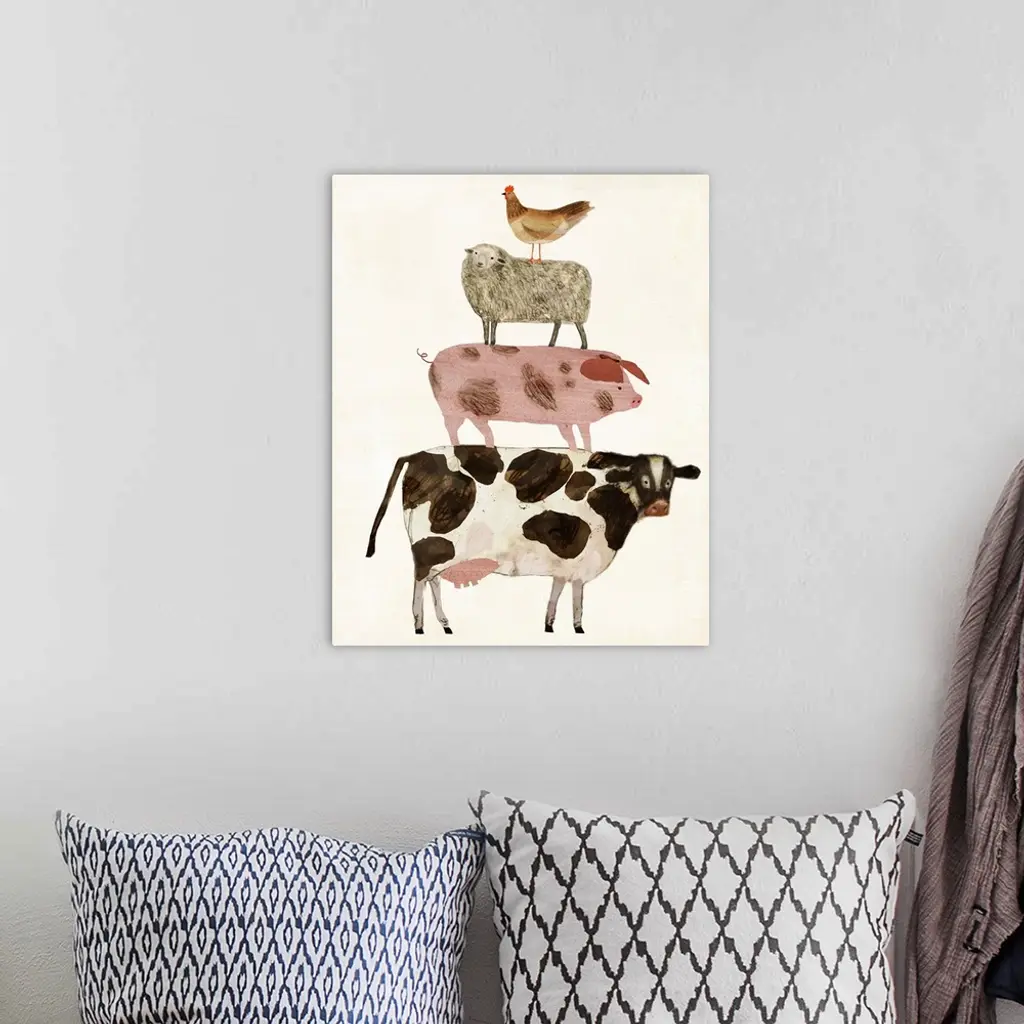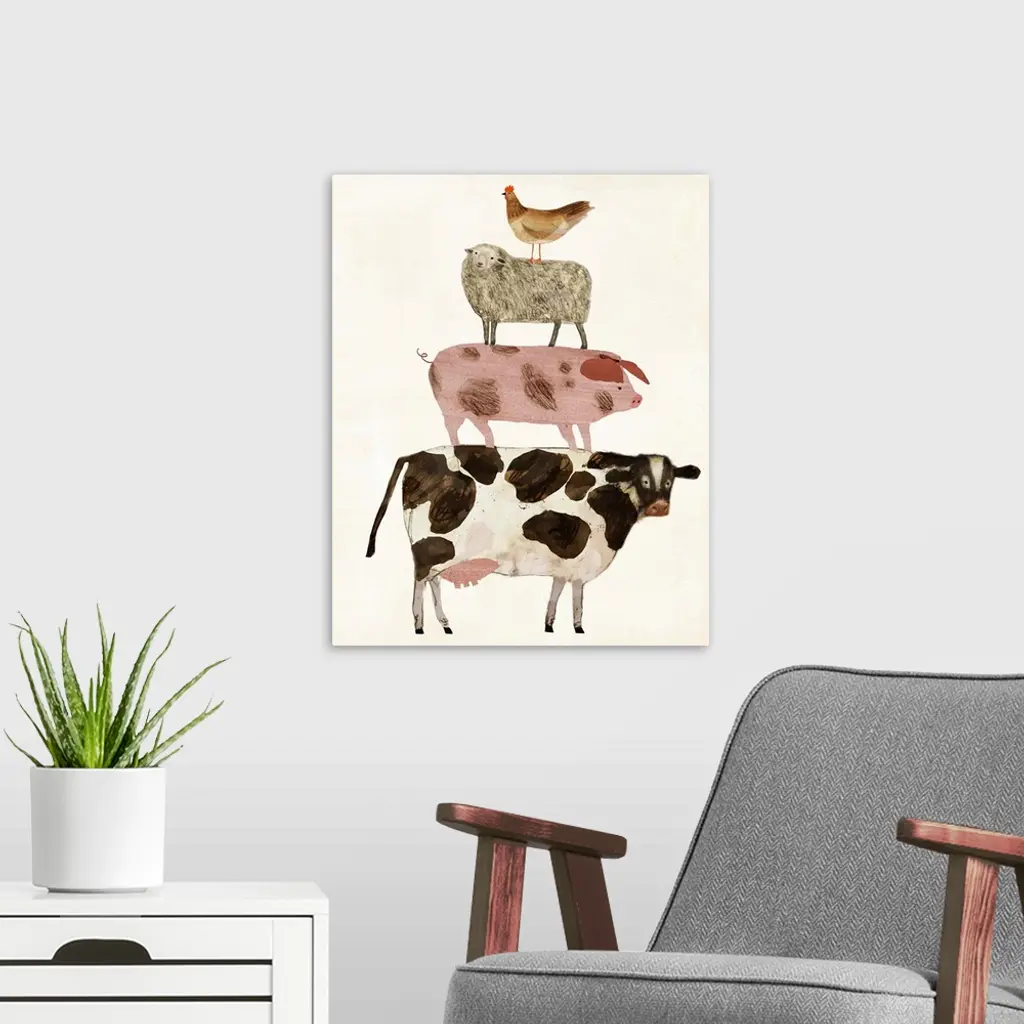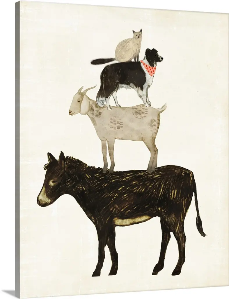 A pyramid of sketched and drawn farm animals fill the neutral distressed background in this decorative folk art.