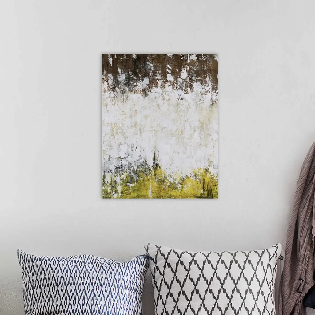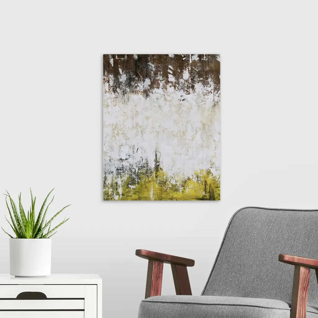 Abstract painting of three horizontal layers that appear sponge painted as they overlap and intersect, each layer in a different color.