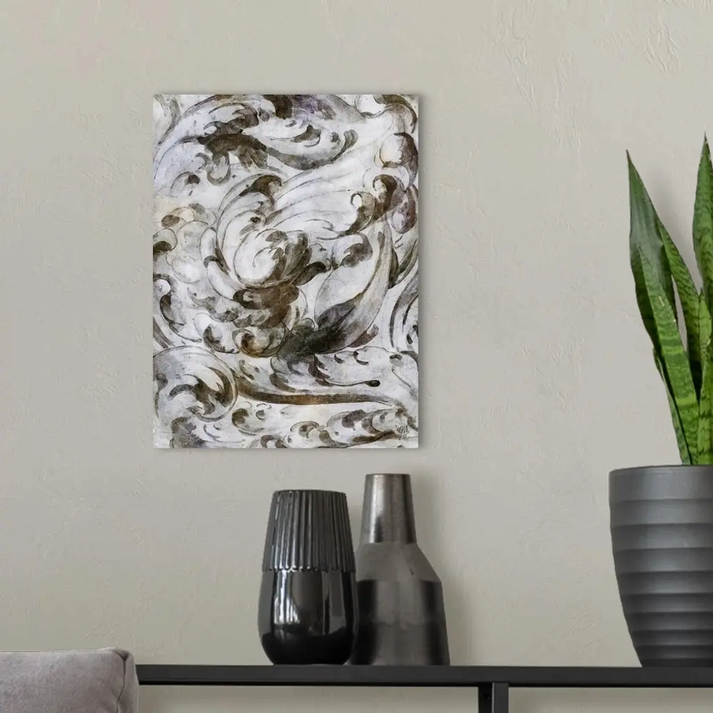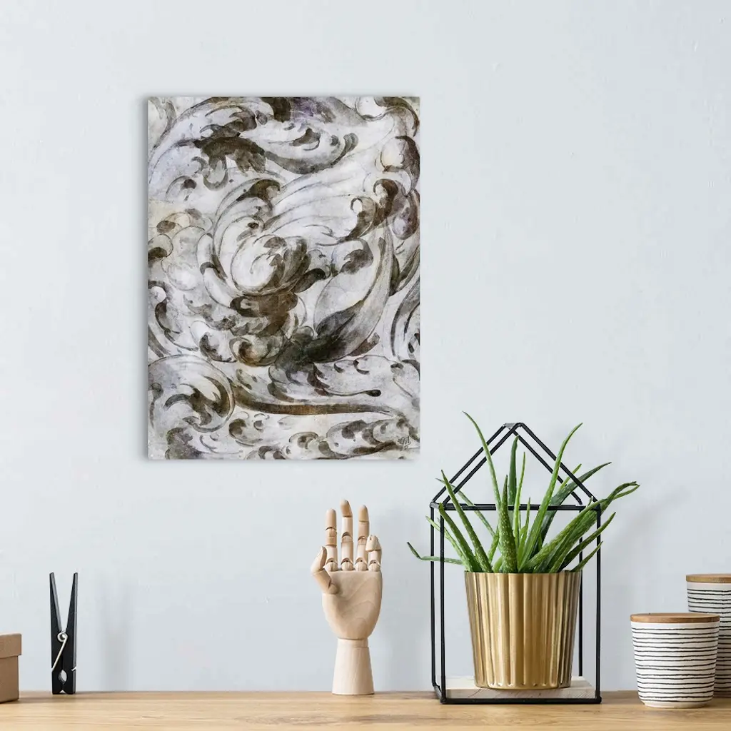 A simple watercolor sketch of a baroque architectural scroll in shades of grey.