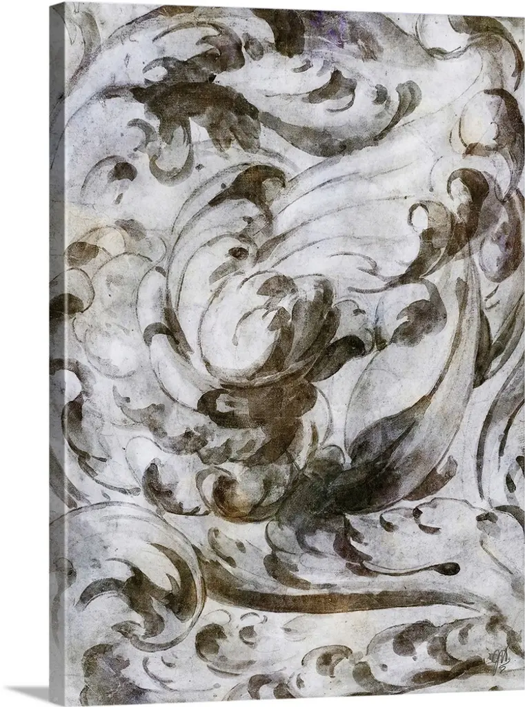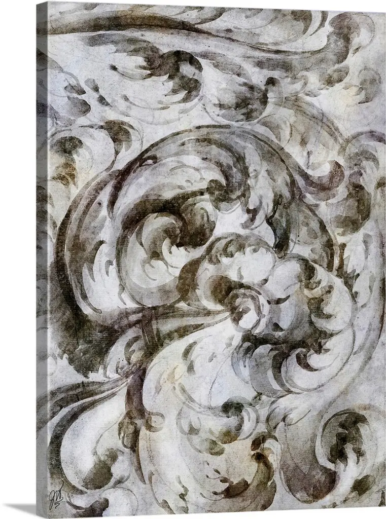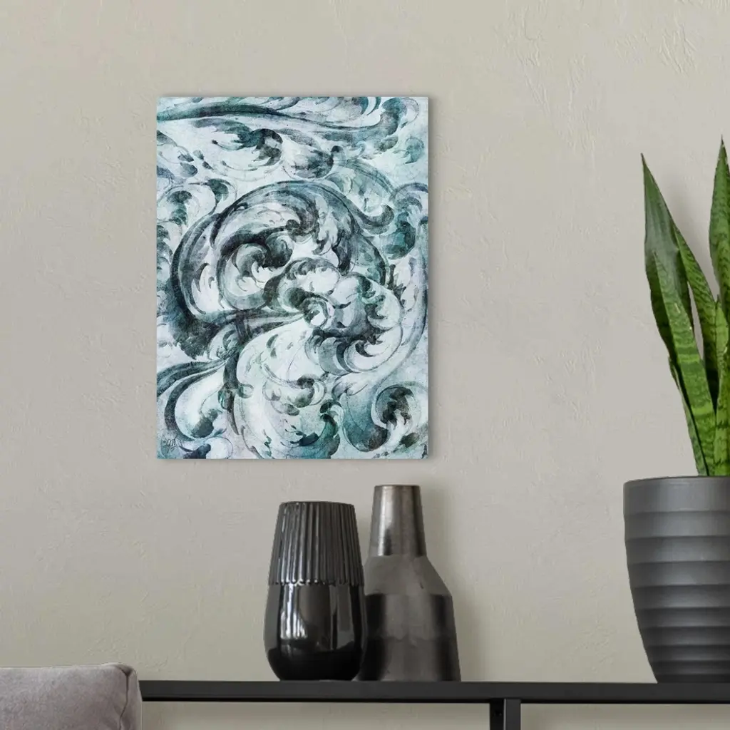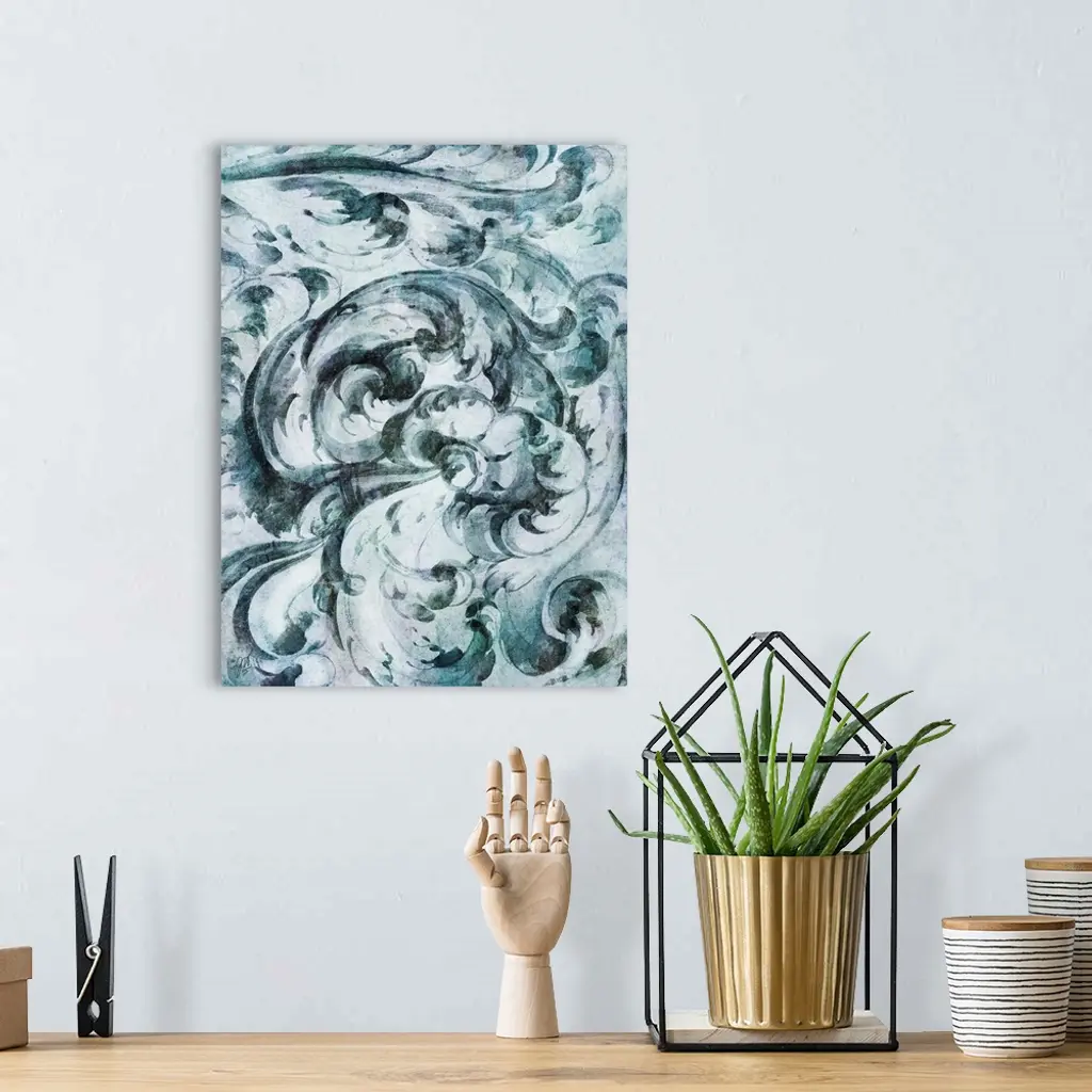 A simple watercolor sketch of a baroque architectural scroll in shades of blue and green.