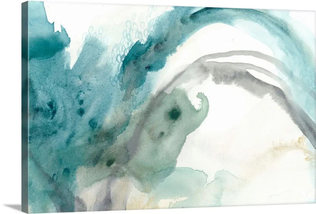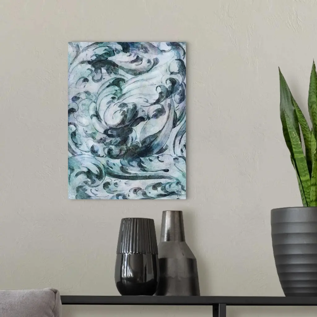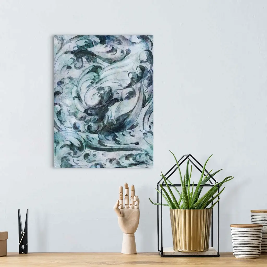 A simple watercolor sketch of a baroque architectural scroll in shades of blue and green.