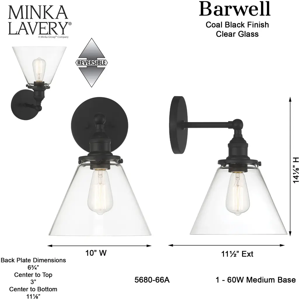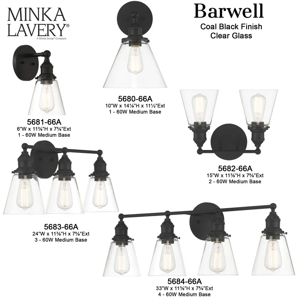 This 1 light Bath Vanity Light from the Barwell collection by Minka-Lavery will enhance your home with a perfect mix of form and function. The features include a Coal Black finish applied by experts. This item qualifies for free shipping!