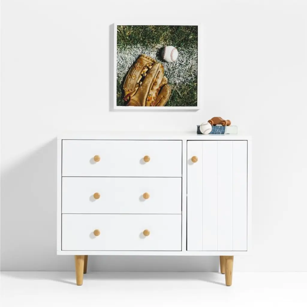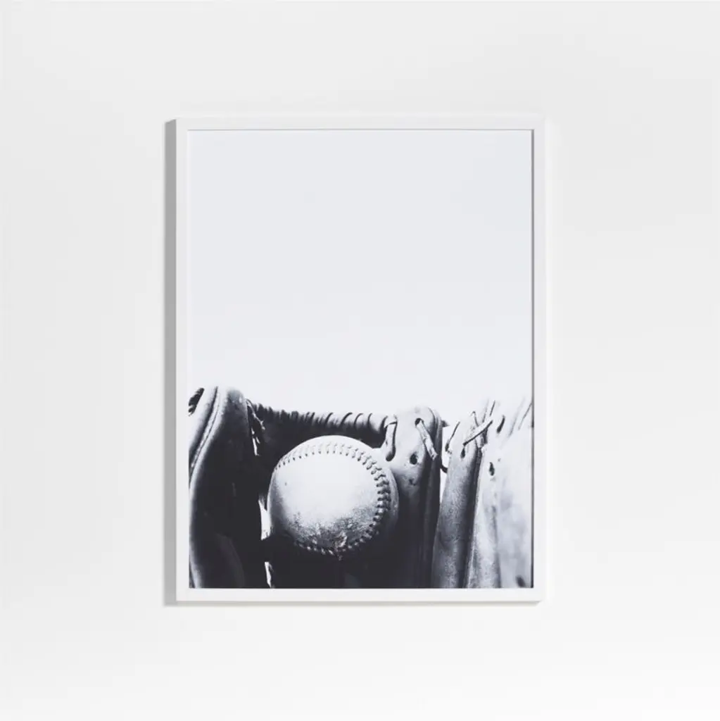 Add a sporty feel to your child's bedroom or playroom with our Baseball Mitt Wall Art. This archival fine art print captures the essence of the game, featuring a closeup shot of a classic baseball mitt and ball on the field. Ready to hang in a modern white frame, it adds big-league charm to kids' spaces.