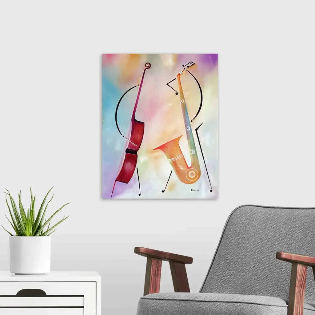 An abstract piece of artwork of a bass standing and a saxophone standing right next to it. The background is multicolored.