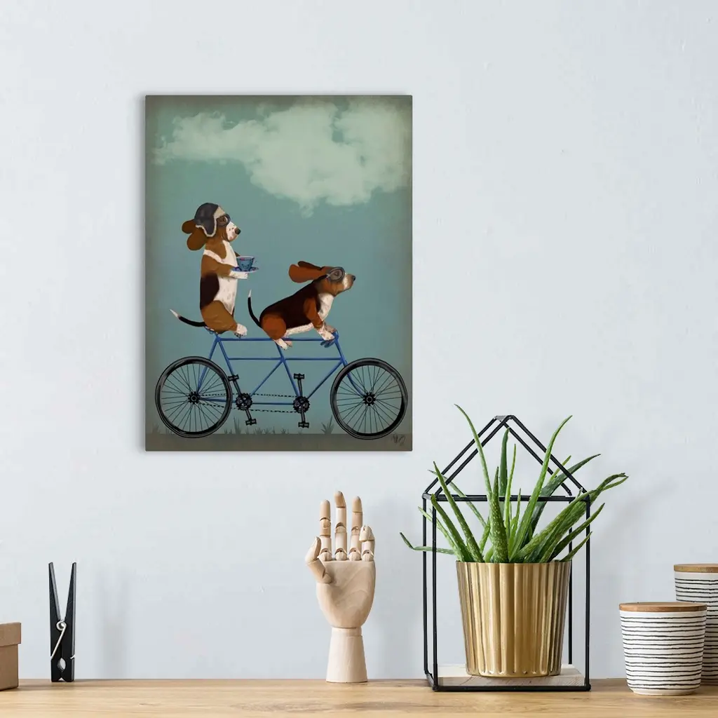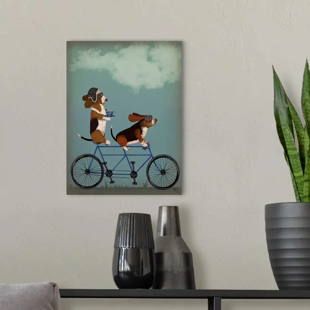 Decorative artwork of two Basset Hounds riding on a tandem bicycle, with the one in the back drinking a cup of tea.