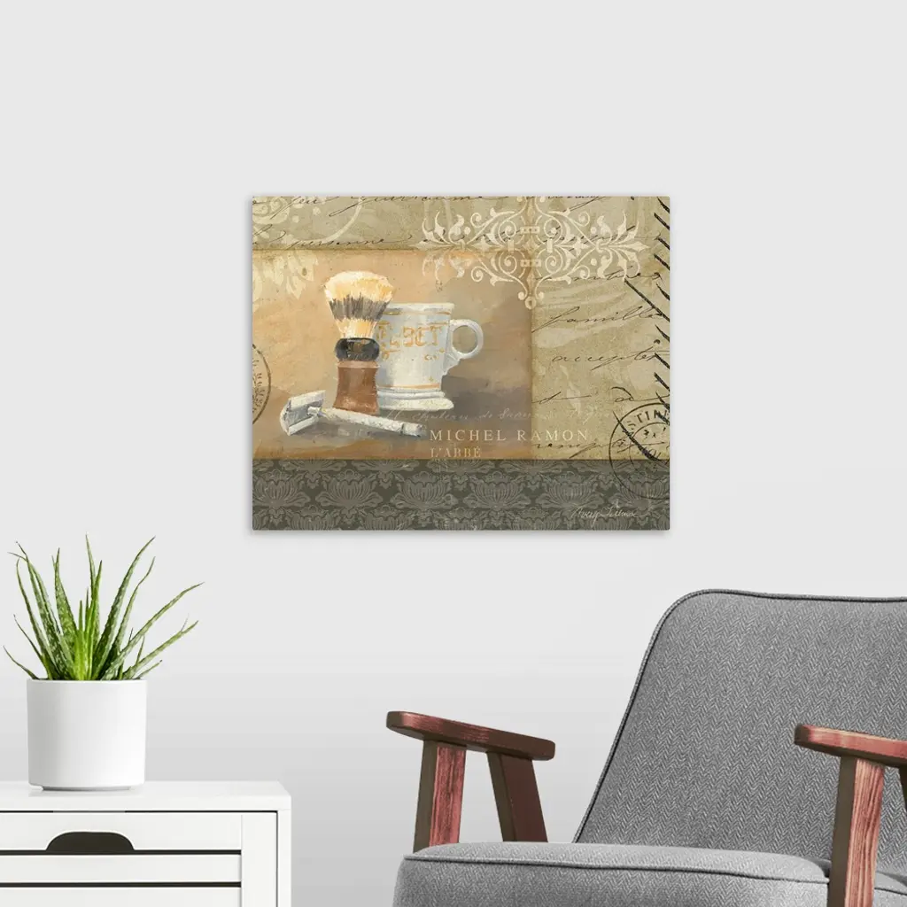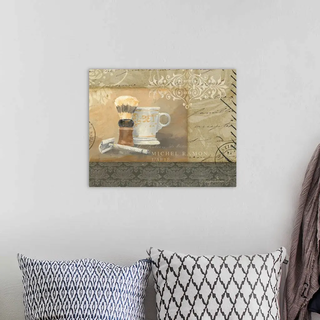 Painting on canvas of make up and bathing products with various patterns in the background.