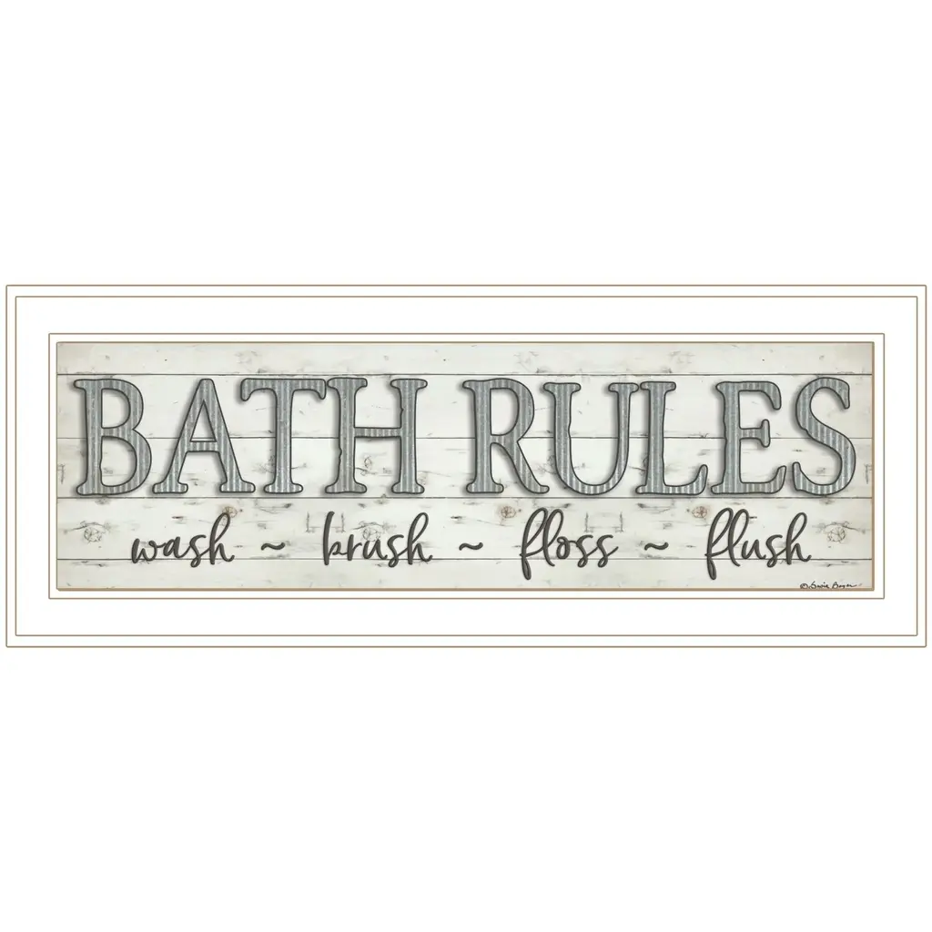 Bring some sizzle to your space with this eye-catching bath rules 1 white framed print wall art. This print is a visual artistic expression that allows you to decorate your space in style. Reproduced for you on paper, this hanging decorative accent will be a trendy and fashionable way to dress your walls. Adding this hanging wall art to your space to make your room feel more finished and attractive. Instantly liven up your space with this art that brings color and dimension to your walls. 9" H x 21" W x 1" D