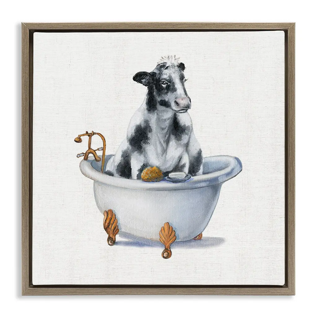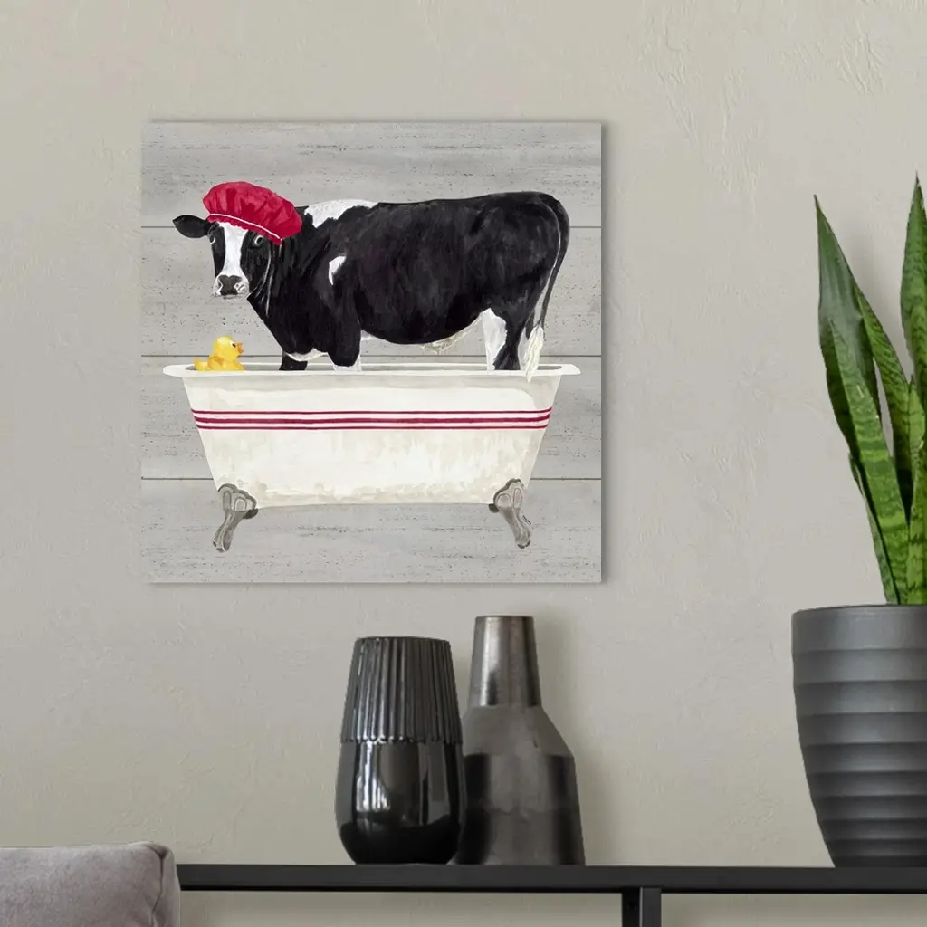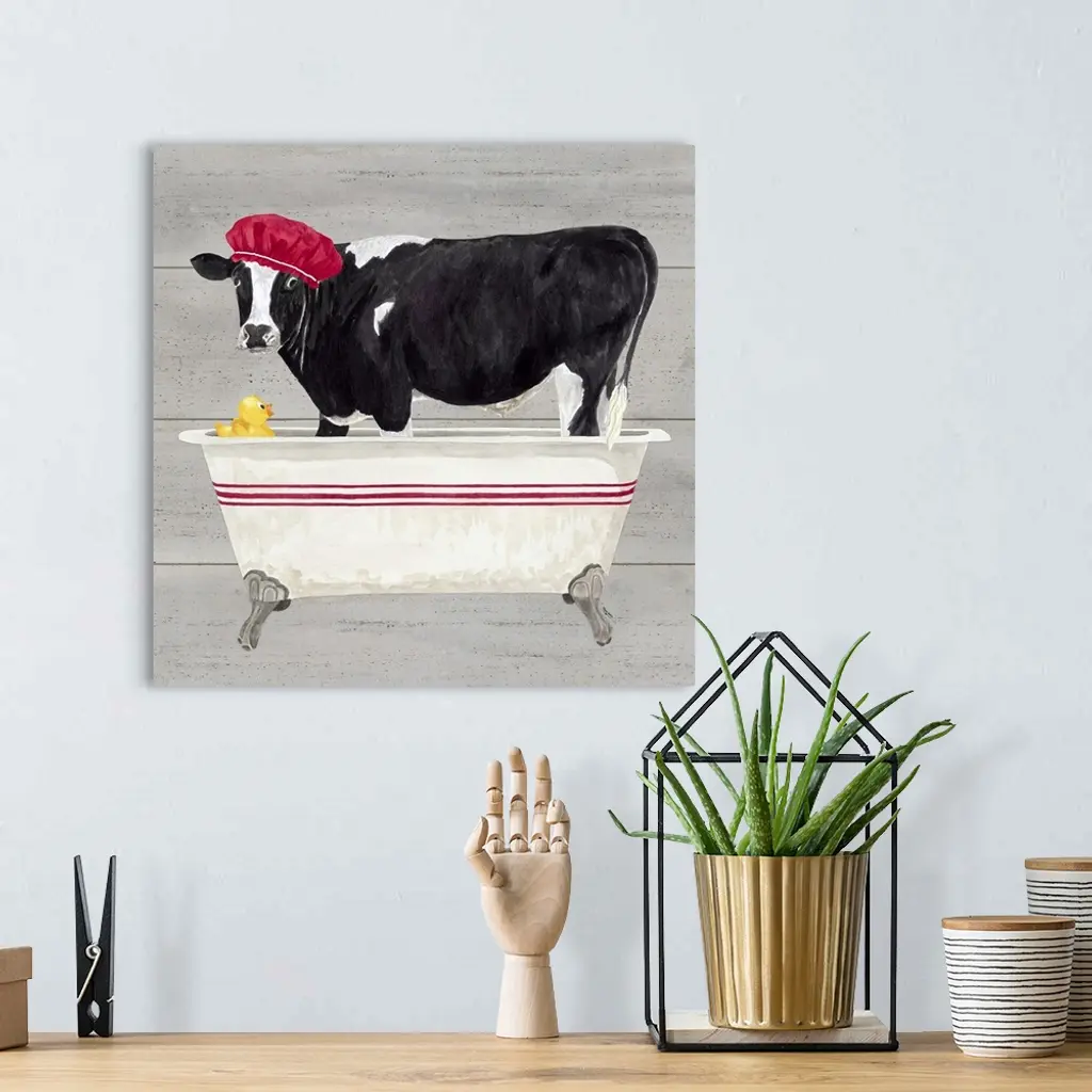 Decorative artwork of a black and white cow standing in a bathtub with a shower cap on it's head and a yellow rubber duck.