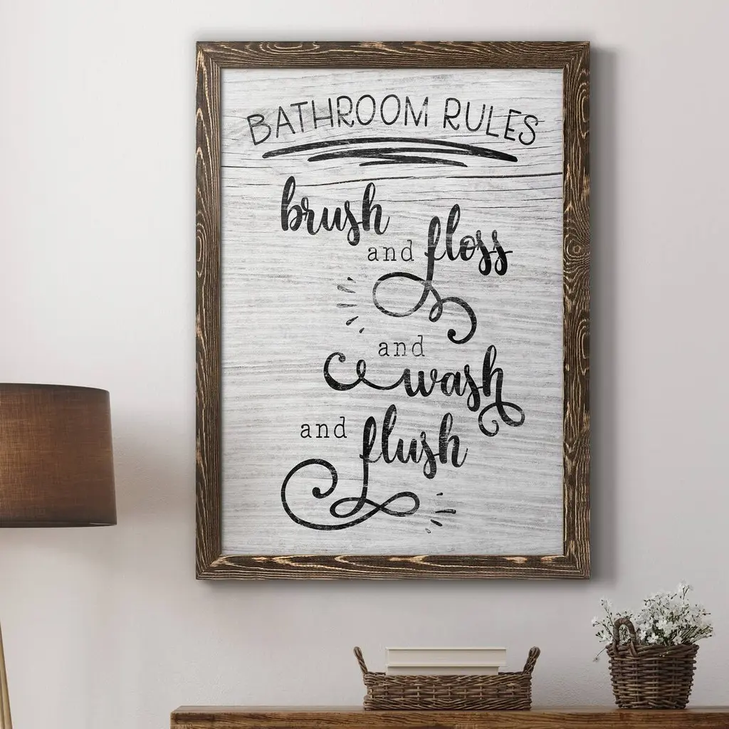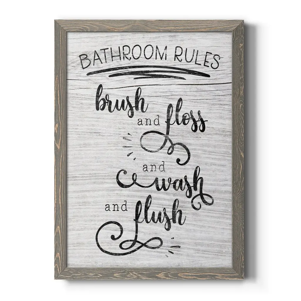 Bathroom Rules-Premium Framed Canvas - Ready to Hang Framed in distressed wood and available in an array of sizes and colors Each piece is joined and assembled by hand and comes ready to hang FRAMED GICLEE CANVAS HAND STRETCHED GALLERY WRAPPED CANVAS READY TO HANG MADE IN THE USA SOLID WOOD FRAME MADE IN USA FADE RESISTANT GICLEE PRINTING on Canvas