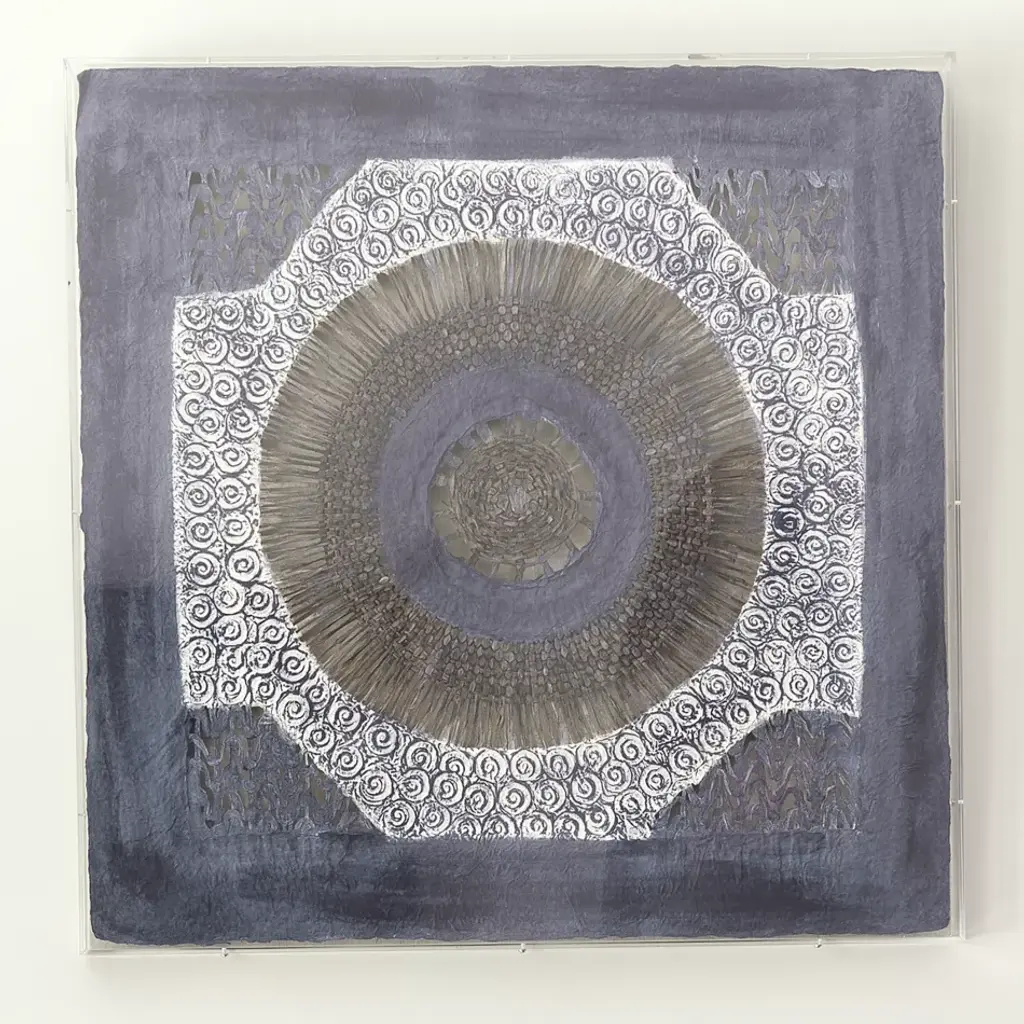 Batik dyed paper in intricate patterns are placed behind acrylic to create this immersive piece of wall art. Using different techniques to create patterns of blue and white print and deep indigo dyed woven paper, this art piece will mesmerize any onlooker.