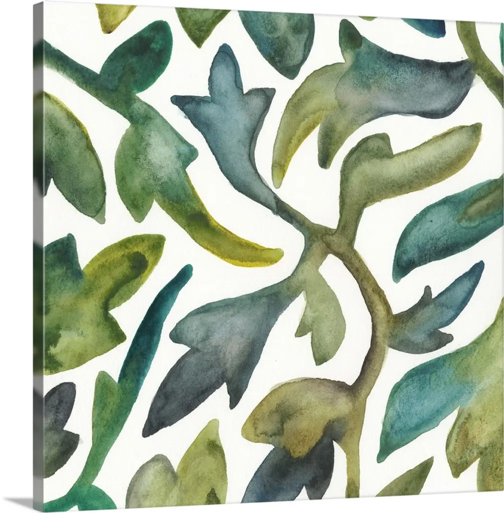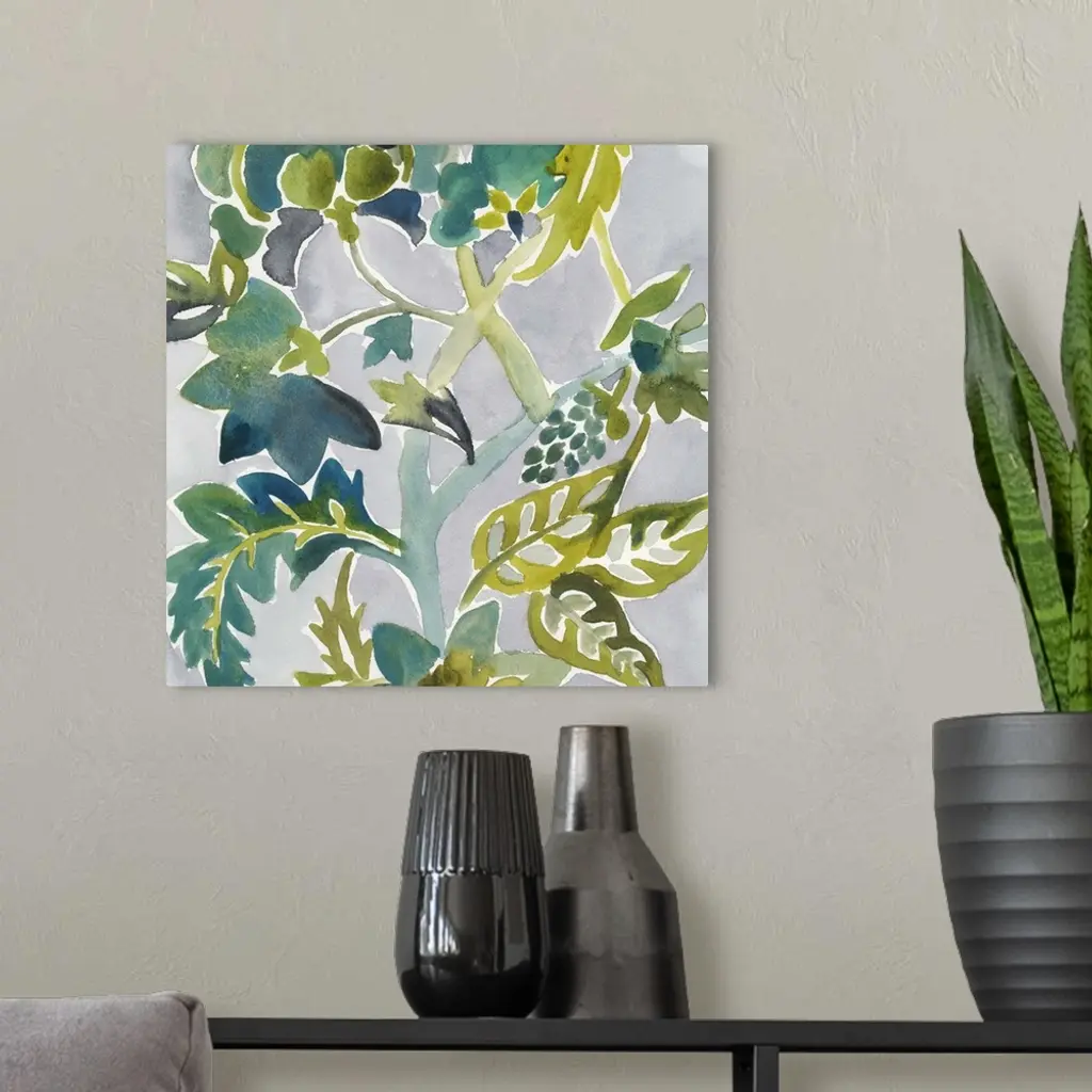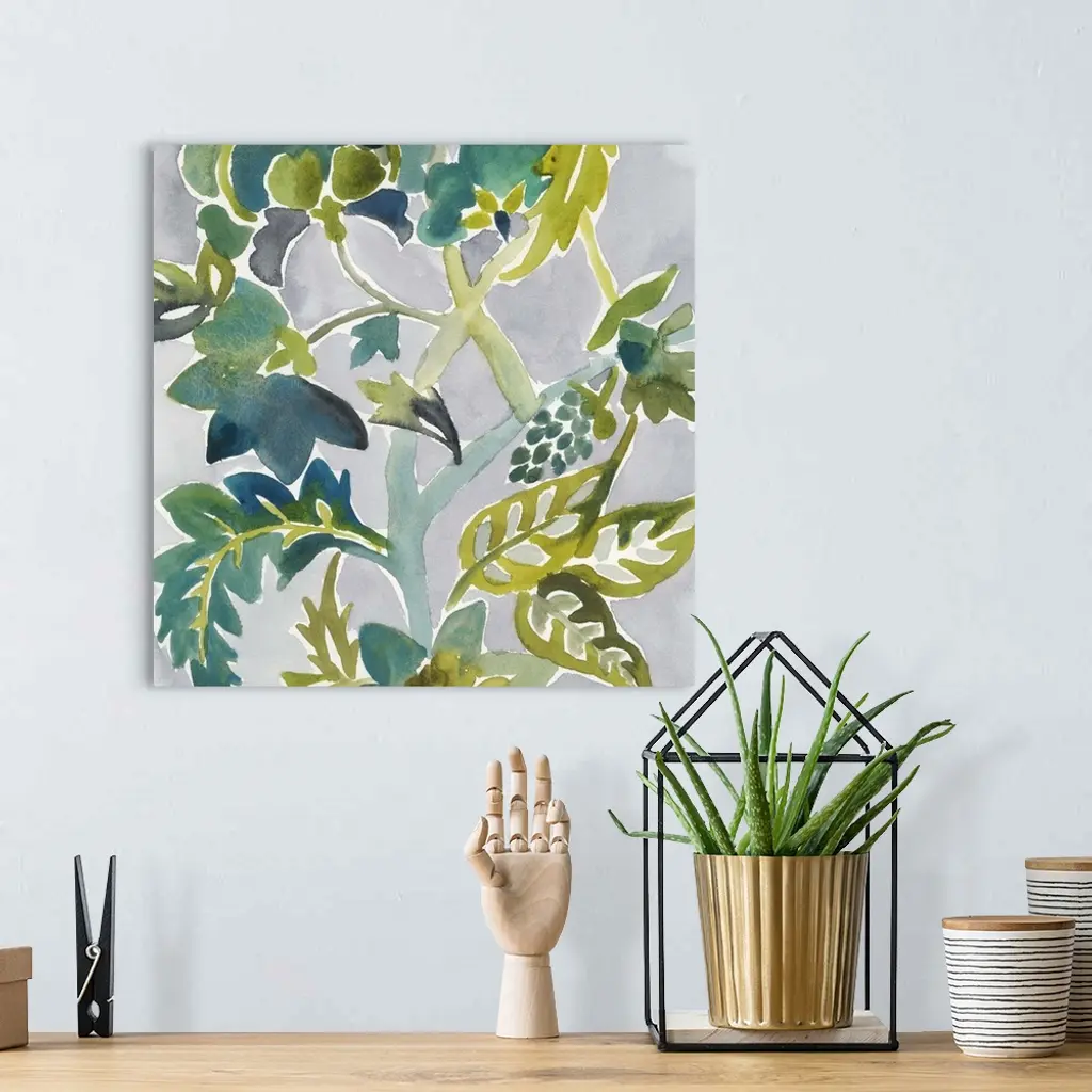 Watercolor painting of delicate vines and floral accents against a soft gray background.