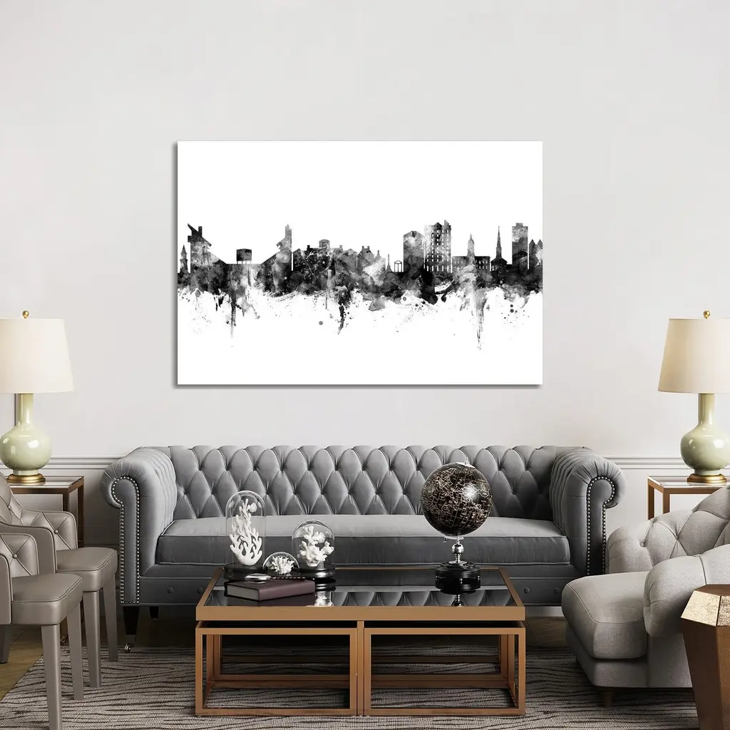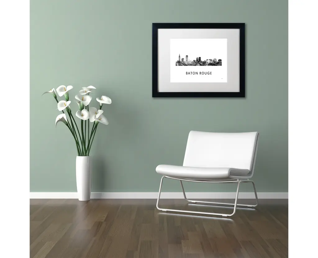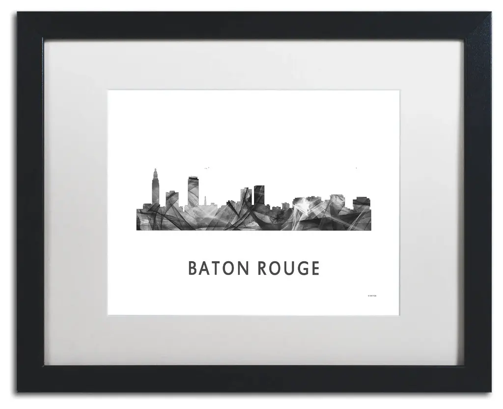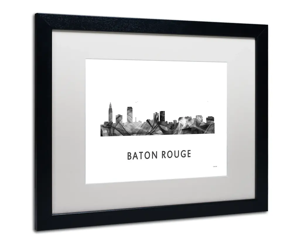 Artist: Marlene WatsonSubject: LandscapesStyle: ContemporaryProduct Type: Black Frame, White Mat, AcrylicMade in USAThis ready to hang, matted framed art piece features a black and white designed silhouette of the Baton Rouge, Louisiana skyline.Born in Scotland and now residing in Hong Kong, Marlene Watson has been painting her way through life. She paints things she notices in everyday life and brings out her positive energy through her work. Marlene has gallery showings and has also illustrated a children's book. She cares for 12 cats and works toward animal conservation and rescues with her art.An 11x14 giclee print under acrylic in a 16x20 black frame. Giclee (jee-clay) is an advanced printmaking process for creating museum quality fine art reproductions. This high quality print is matted using antique white matting and comes in a black frame. A clear acrylic facing is added to protect the print. The piece is fully assembled by professional framers and comes ready to hang. The antique white mat allows the image to really stand out, making it a great addition to any space.
