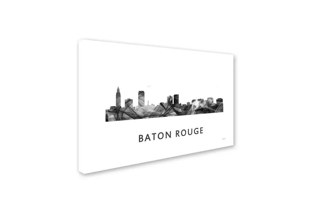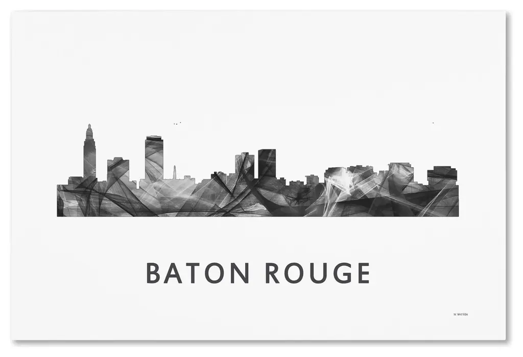 Artist: Marlene WatsonSubject: LandscapesStyle: ContemporaryProduct Type: Gallery-Wrapped Canvas ArtMade in USAThis ready to hang, gallery-wrapped art piece features a black and white designed silhouette of the Baton Rouge, Louisiana skyline.Born in Scotland and now residing in Hong Kong, Marlene Watson has been painting her way through life. She paints things she notices in everyday life and brings out her positive energy through her work. Marlene has gallery showings and has also illustrated a children's book. She cares for 12 cats and works toward animal conservation and rescues with her art.Giclee (jee-clay) is an advanced printmaking process for creating high quality fine art reproductions. The attainable excellence that Giclee printmaking affords makes the reproduction virtually indistinguishable from the original piece. The result is wide acceptance of Giclee by galleries, museums, and private collectors. Gallery wrap is a method of stretching an artist's canvas so that the canvas wraps around the sides and is secured a hidden, wooden frame. This method of stretching and preparing a canvas allows for a frameless presentation of the finished painting.