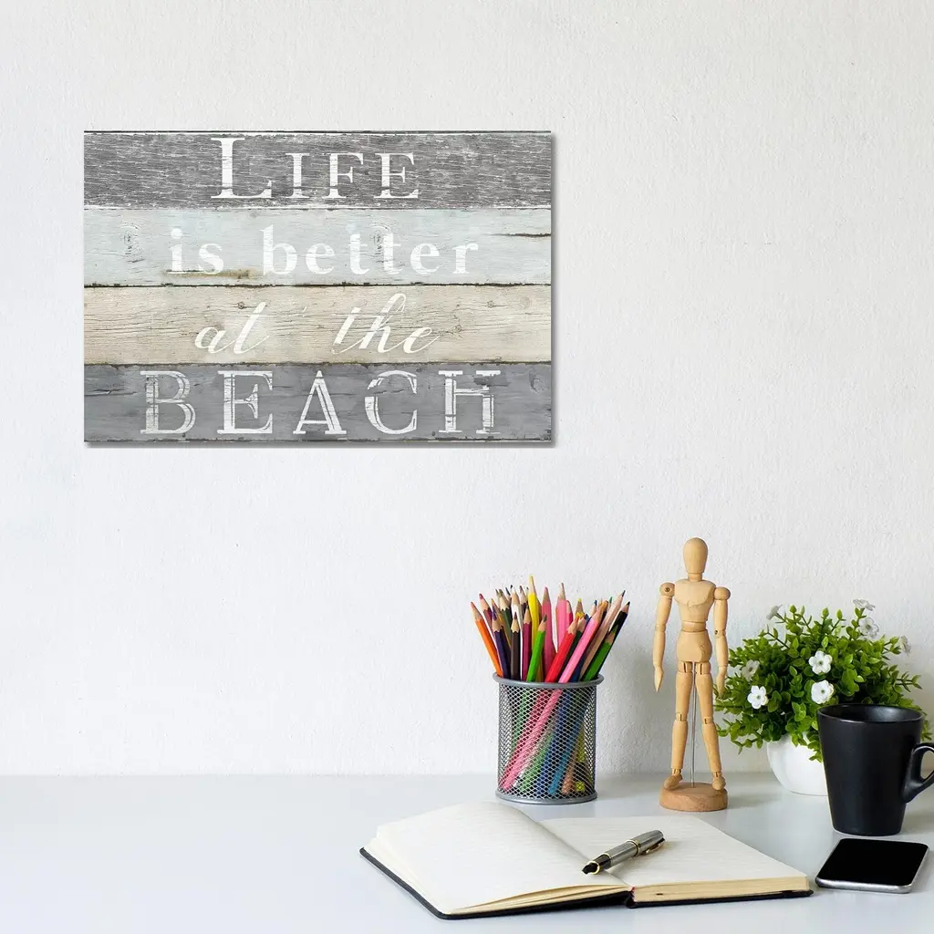 Happiness comes in the flow of the waves. Show your love of all things beach side with this lovely wall art. The perfect addition to the coastal themed decor. Features: Reads ''Life is better at the beach'' inside a silhouetted clam shell lined with lights Weathered painted wooden slat base Accented with a starfish an anchor and a palm tree island Pre-lit with 30 warm white LED lights Can be hung on the wall or placed on a table top Convenient on/off switch at the top Requires 2 ''AA'' batteries - Not included Recommended for indoor use Dimensions: 12"H x 12"W x 1"D Material(s): plastic