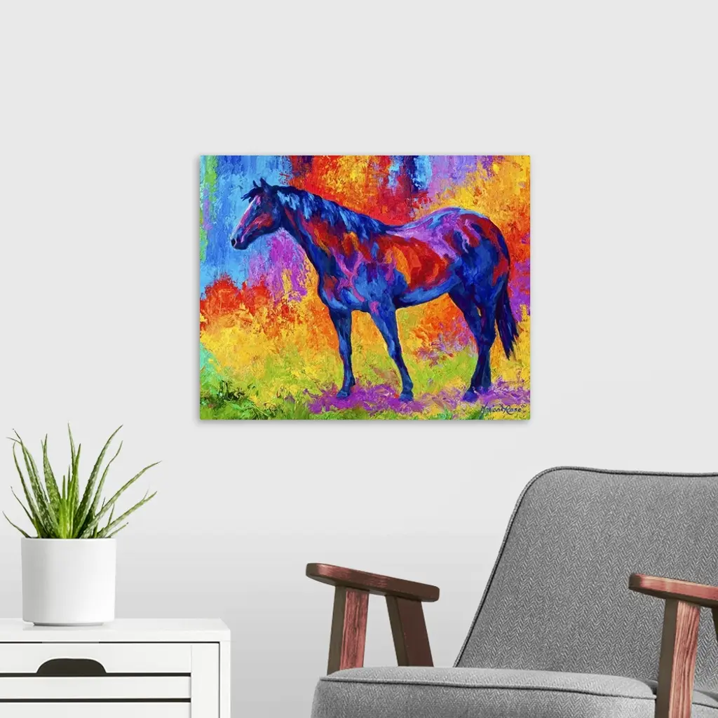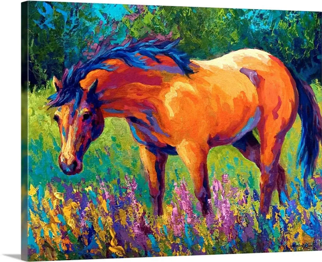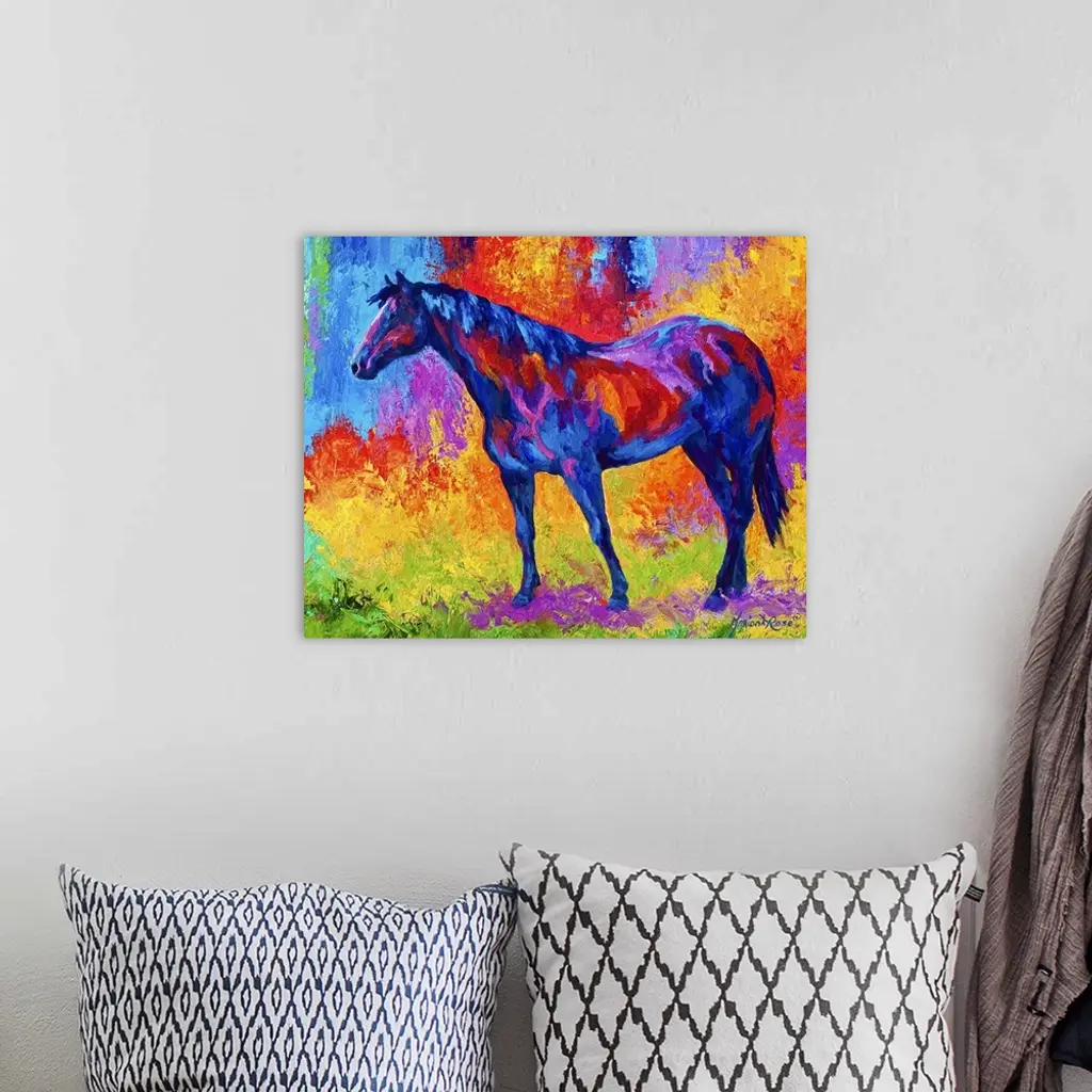 Abstract painting on canvas of a horse made up of various bright colors.