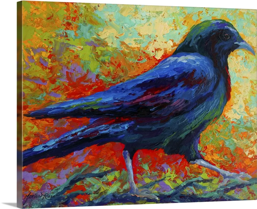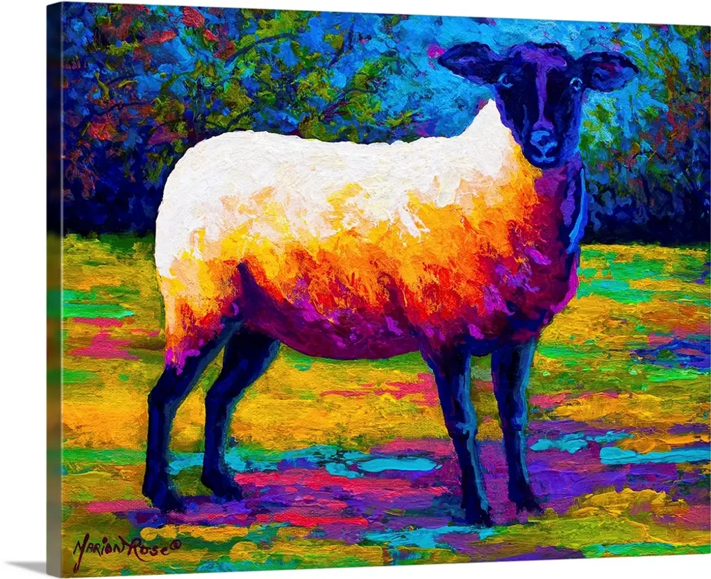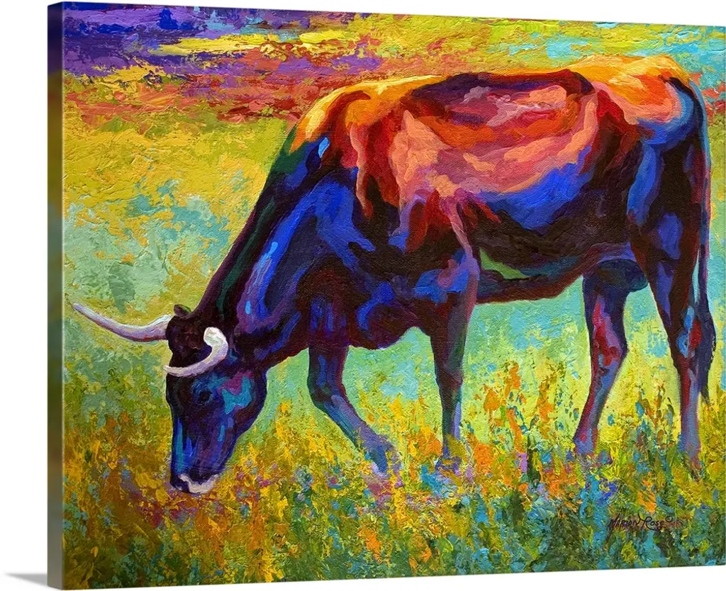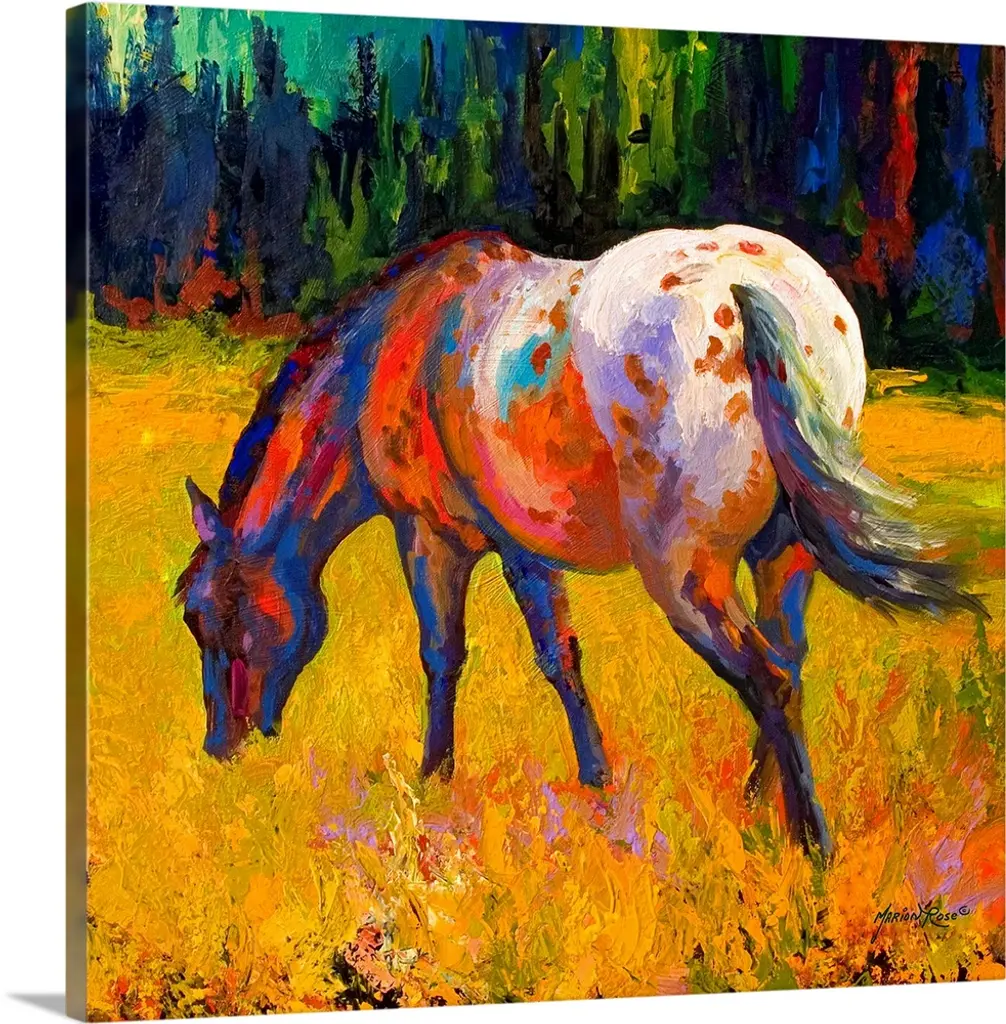 Abstract painting on canvas of a horse made up of various bright colors.