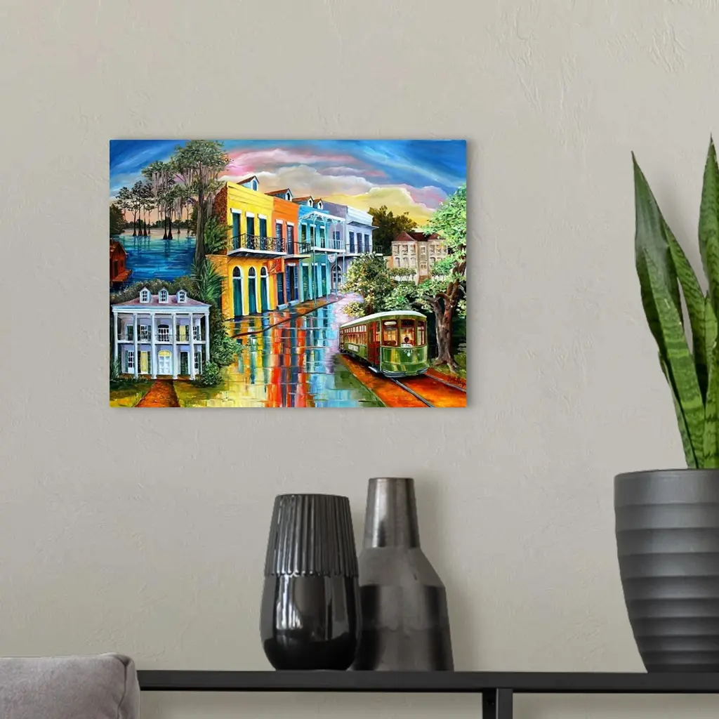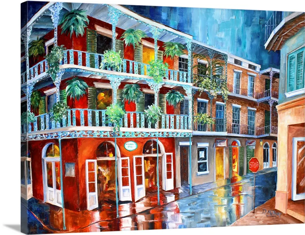 Contemporary painting of New Orleans at night illuminated in vibrant colors.