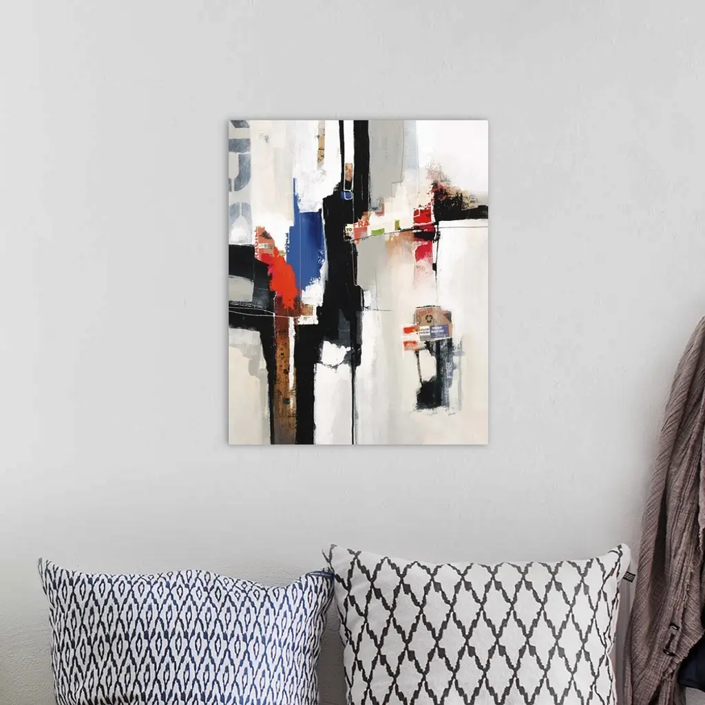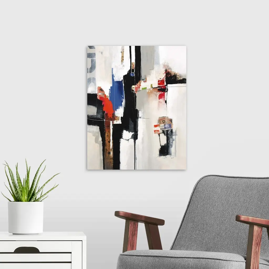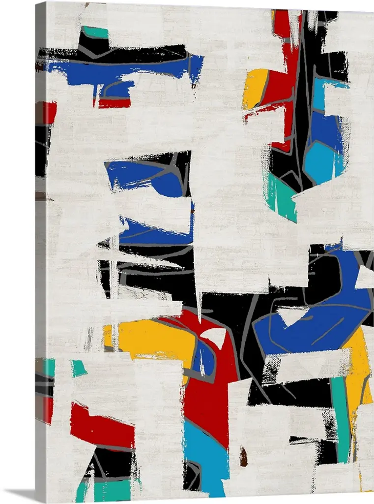 Contemporary abstract painting using bold colors and harsh lines against a neutral background.