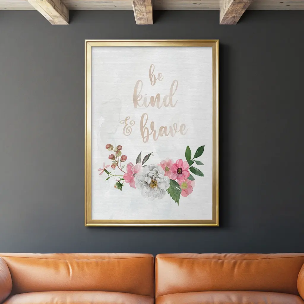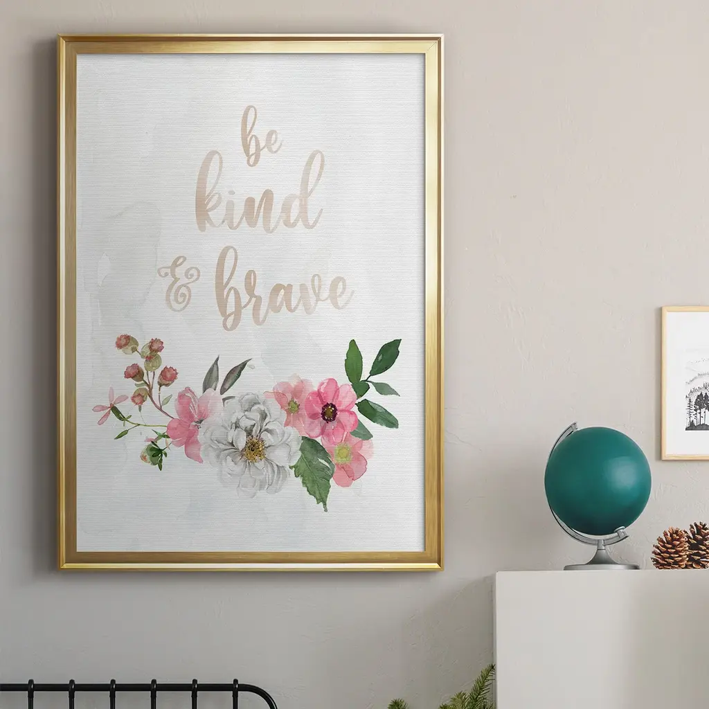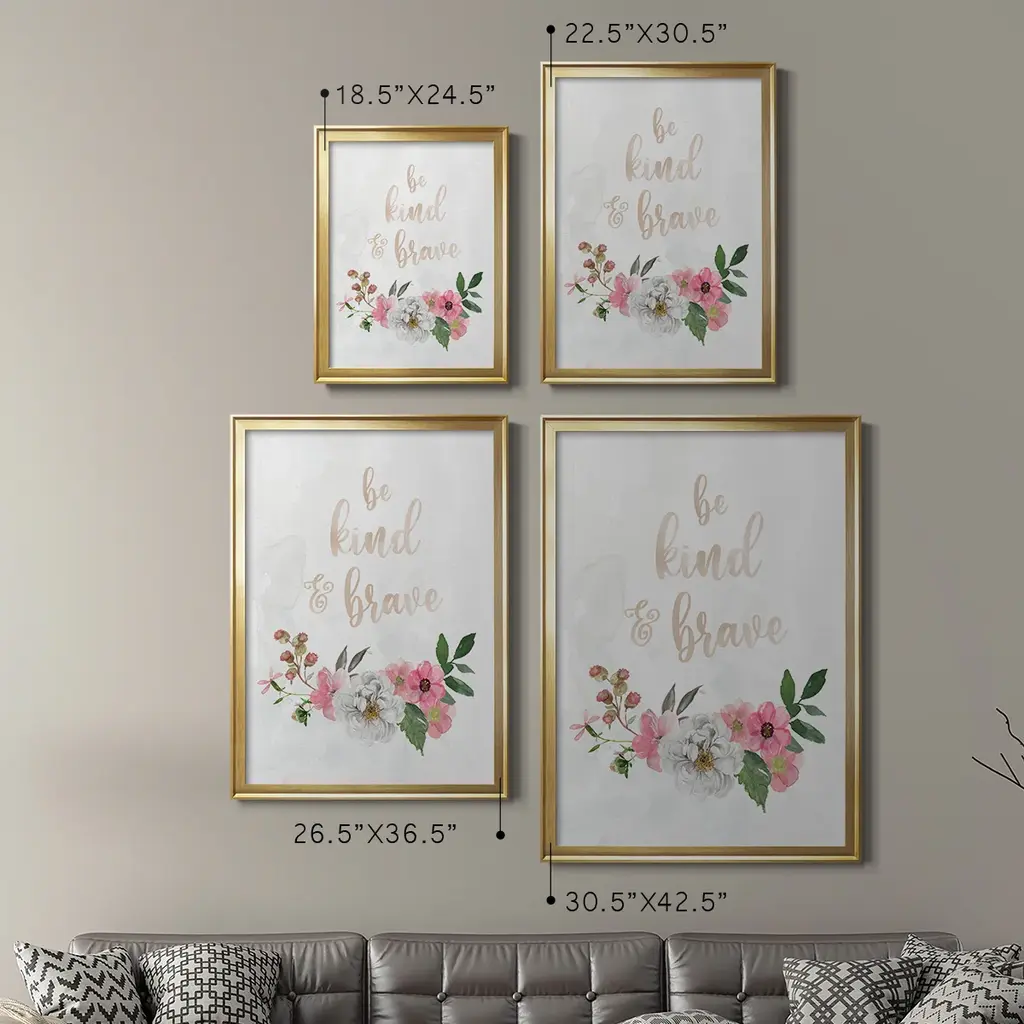 Be Kind and Brave Premium Framed Print - Ready to Hang A Premium Framed Print created to last. Framed in distressed wood and available in an array of sizes and colors Featuring a beveled a solid wood stretcher bar, each piece comes ready to hand 4 SIZES AVAILABLE 30.5''X42.5'' - Overall Size 26.5'X36.5'' - Overall Size 22.5''x30.5'' - Overall Size 18.5''x24.5'' - Overall Size Each piece is made to order. Each piece comes with hanging hardware. Made in the USA Ready to Hang