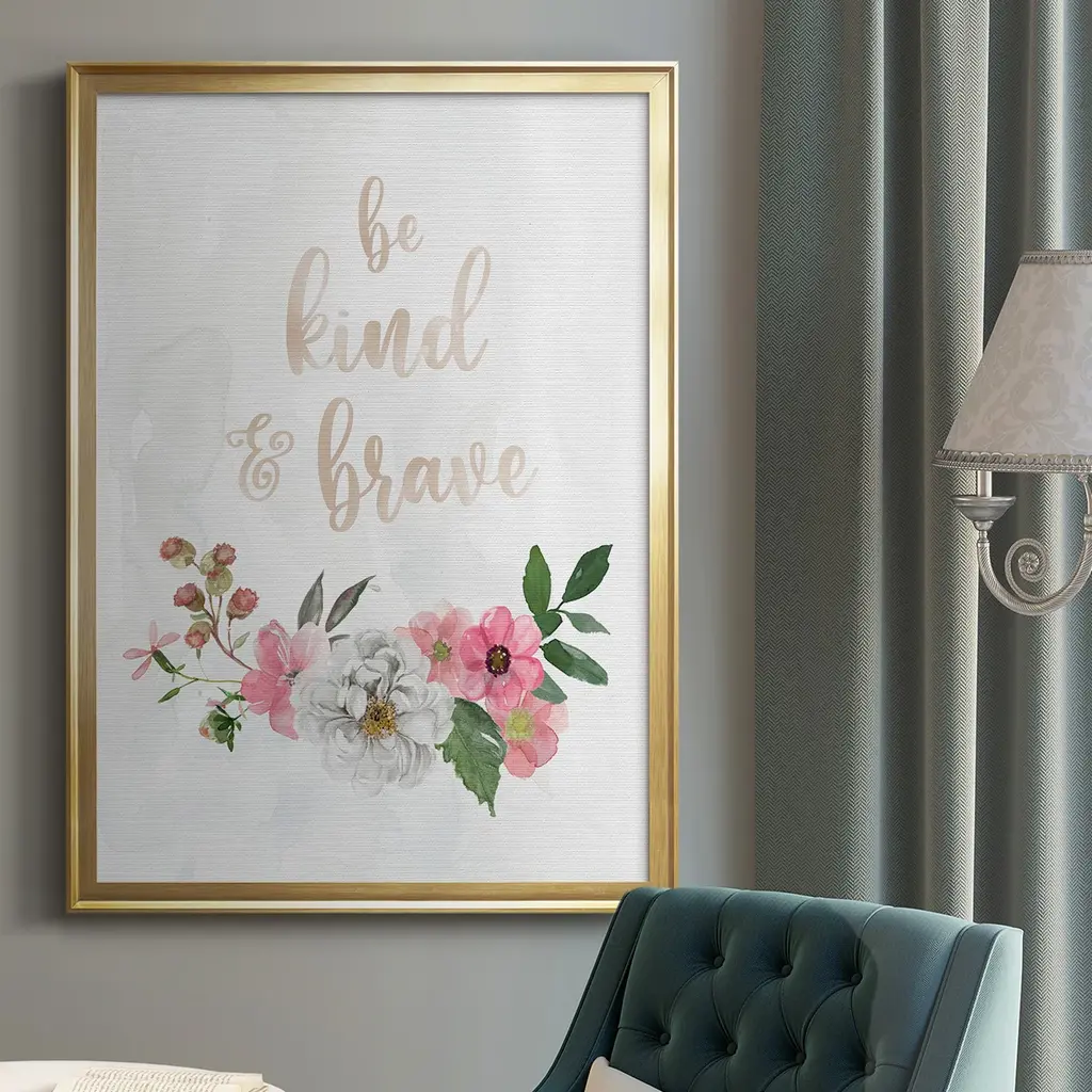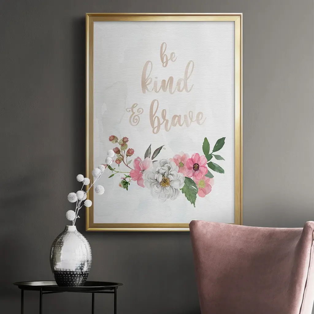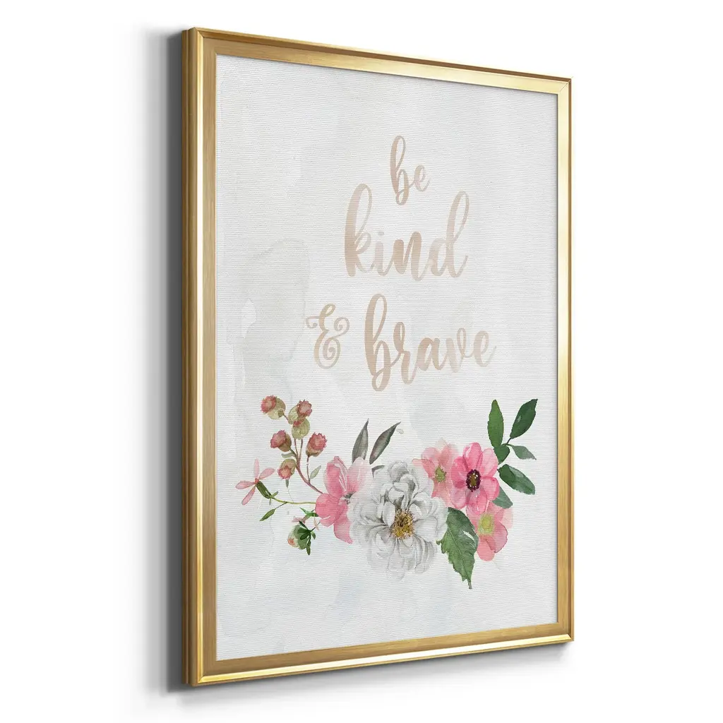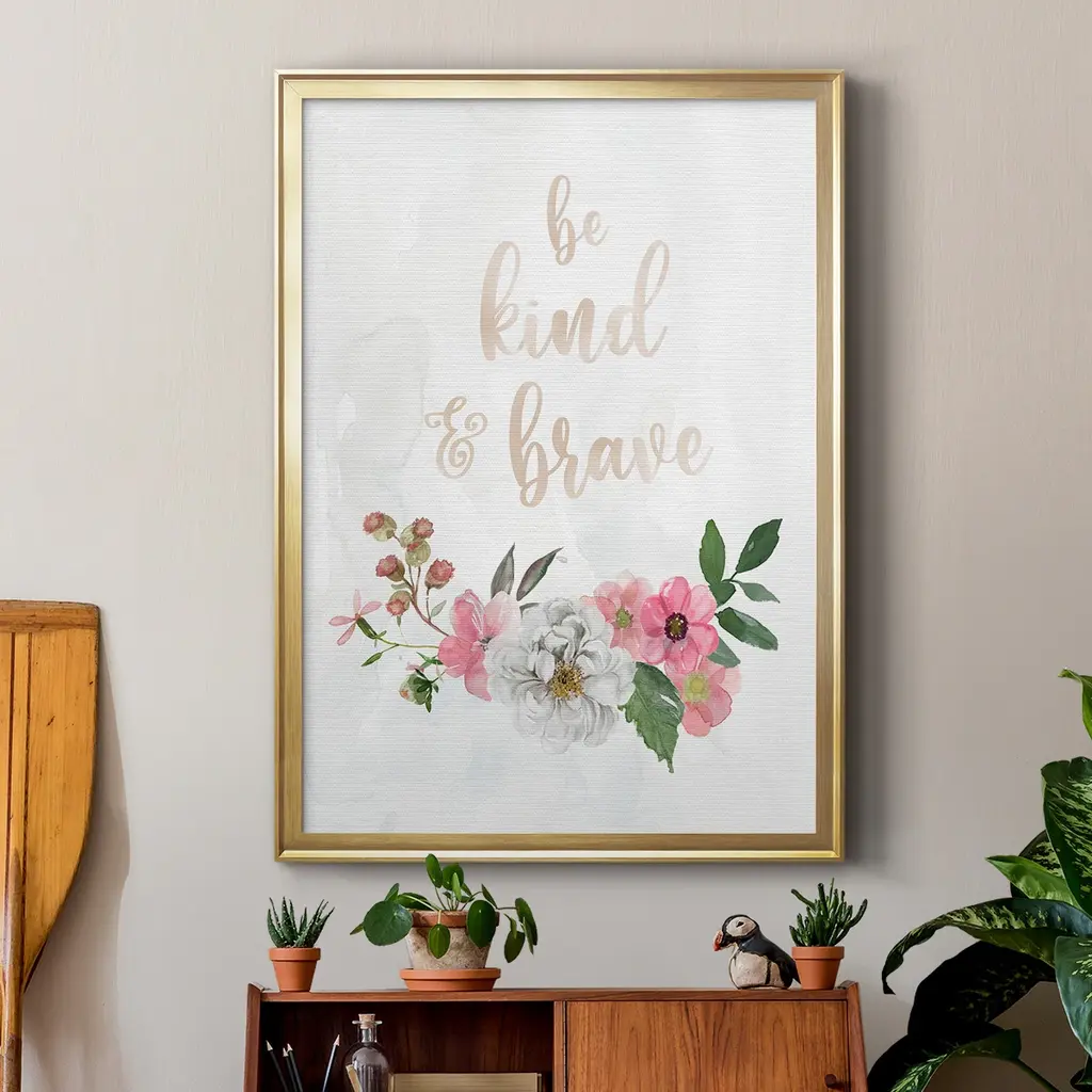 Be Kind and Brave Premium Framed Print - Ready to Hang A Premium Framed Print created to last. Framed in distressed wood and available in an array of sizes and colors Featuring a beveled a solid wood stretcher bar, each piece comes ready to hand 4 SIZES AVAILABLE 30.5''X42.5'' - Overall Size 26.5'X36.5'' - Overall Size 22.5''x30.5'' - Overall Size 18.5''x24.5'' - Overall Size Each piece is made to order. Each piece comes with hanging hardware. Made in the USA Ready to Hang