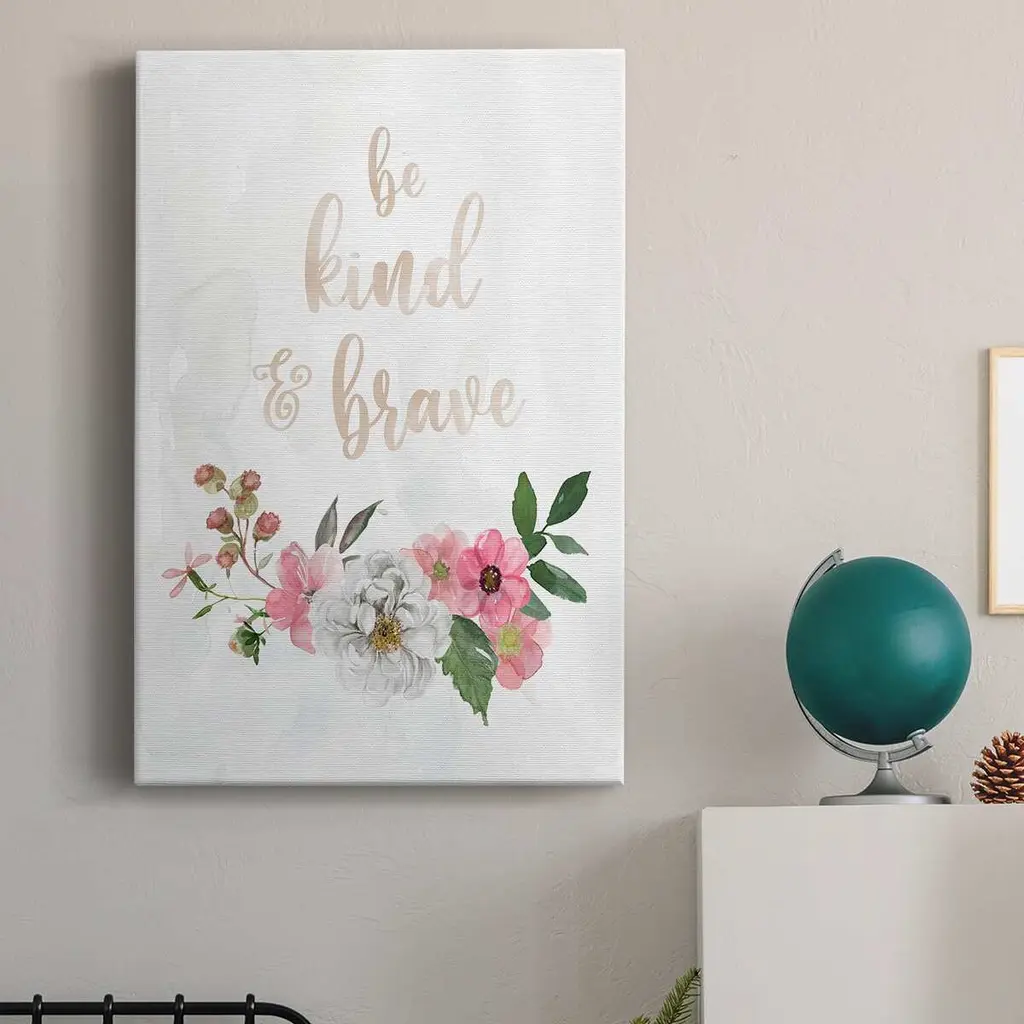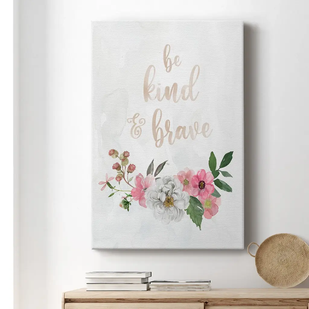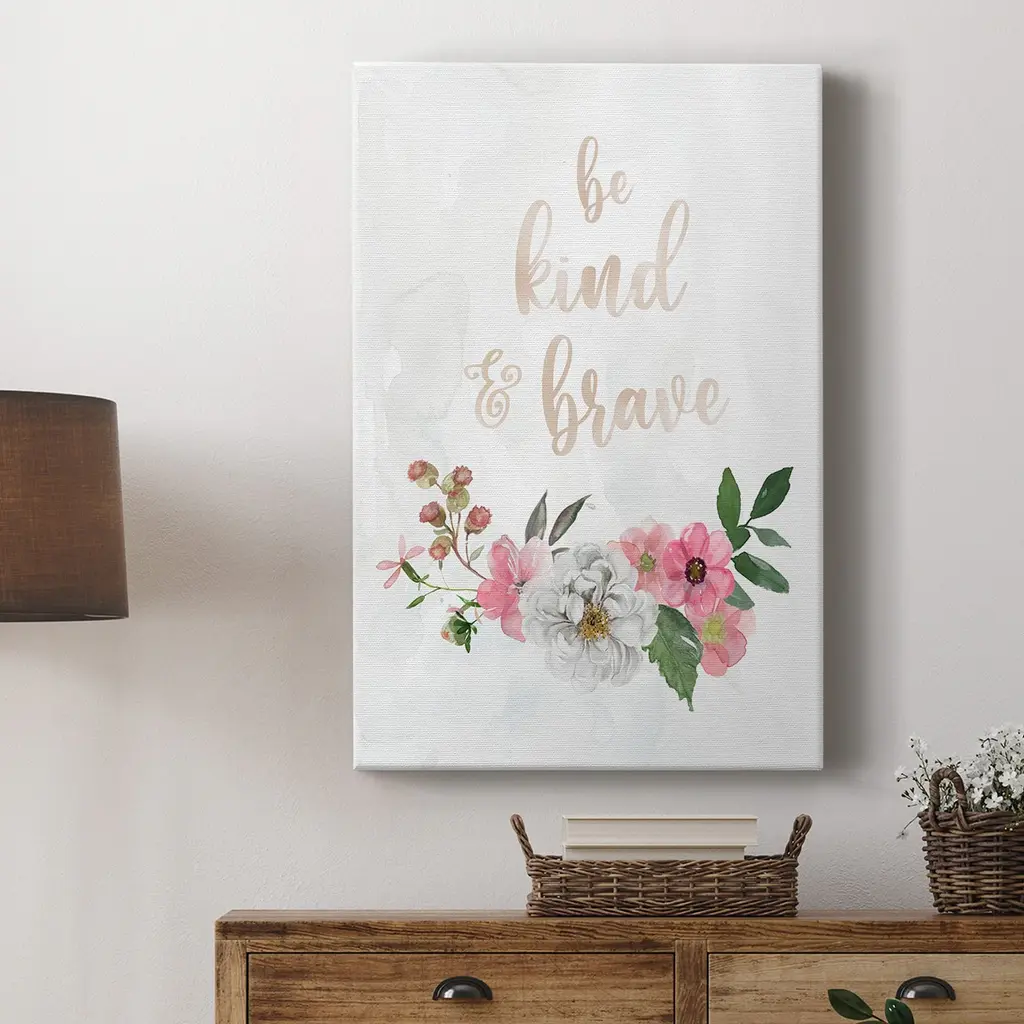 Be Kind and Brave Premium Gallery Wrapped Canvas - Ready to Hang A premium hand stretched gallery wrapped canvas print created to last. Featuring a beveled a solid wood stretcher bar, each piece comes ready to hand 6 SIZES AVAILABLE 8''X12'' - Overall Size 12''X18'' - Overall Size 18''X27'' - Overall Size 24''x36'' - Overall Size 32''x48'' - Overall Size 40''x60'' - Overall Size Each piece is made to order. Built to Last Each piece comes ready to hang Solid wood stretcher Fade and Water resistant Made domestically