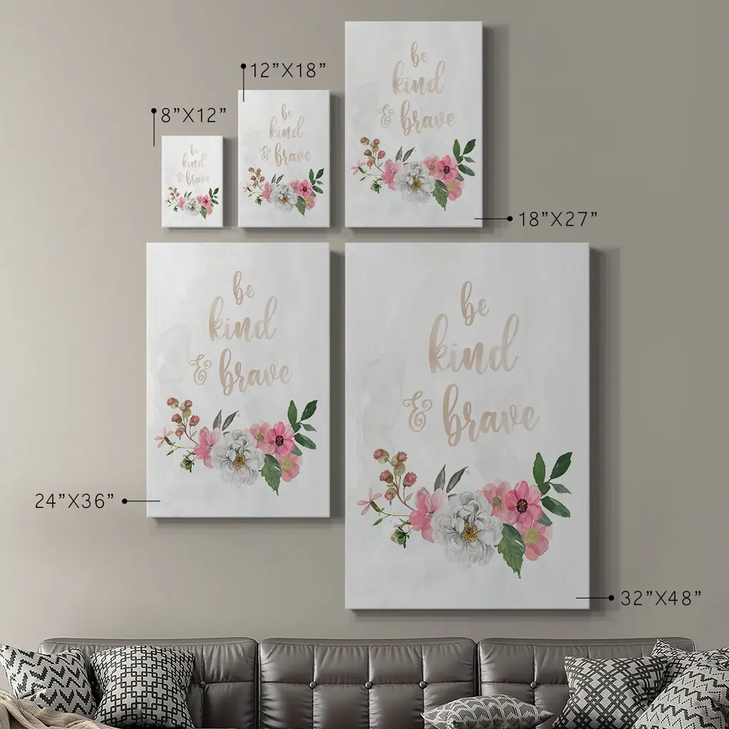 Be Kind and Brave Premium Gallery Wrapped Canvas - Ready to Hang A premium hand stretched gallery wrapped canvas print created to last. Featuring a beveled a solid wood stretcher bar, each piece comes ready to hand 6 SIZES AVAILABLE 8''X12'' - Overall Size 12''X18'' - Overall Size 18''X27'' - Overall Size 24''x36'' - Overall Size 32''x48'' - Overall Size 40''x60'' - Overall Size Each piece is made to order. Built to Last Each piece comes ready to hang Solid wood stretcher Fade and Water resistant Made domestically