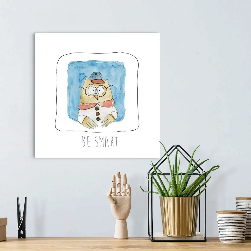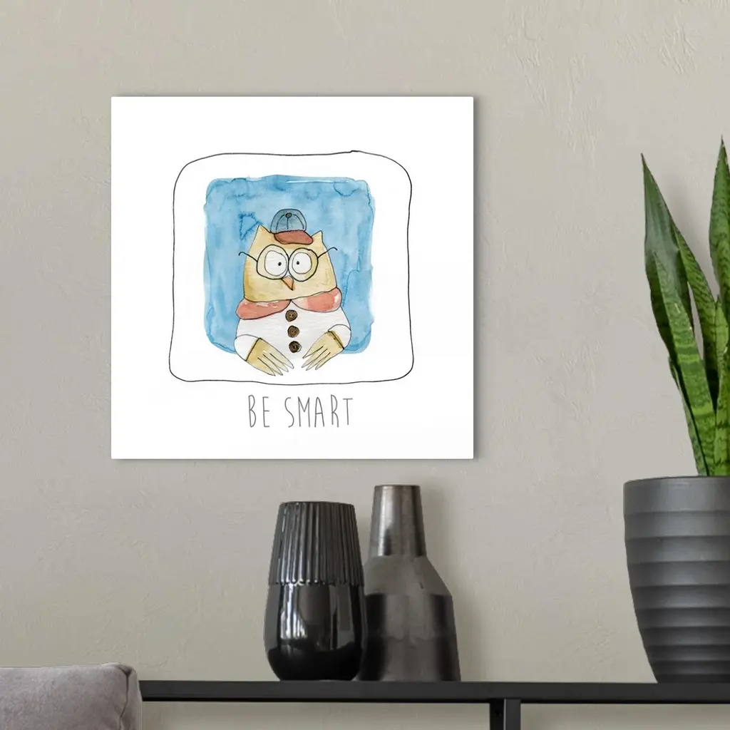 Square whimsy watercolor painting of an owl wearing clothes and glasses with the phrase "Be Smart" written at the bottom.