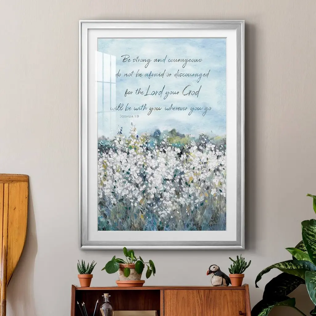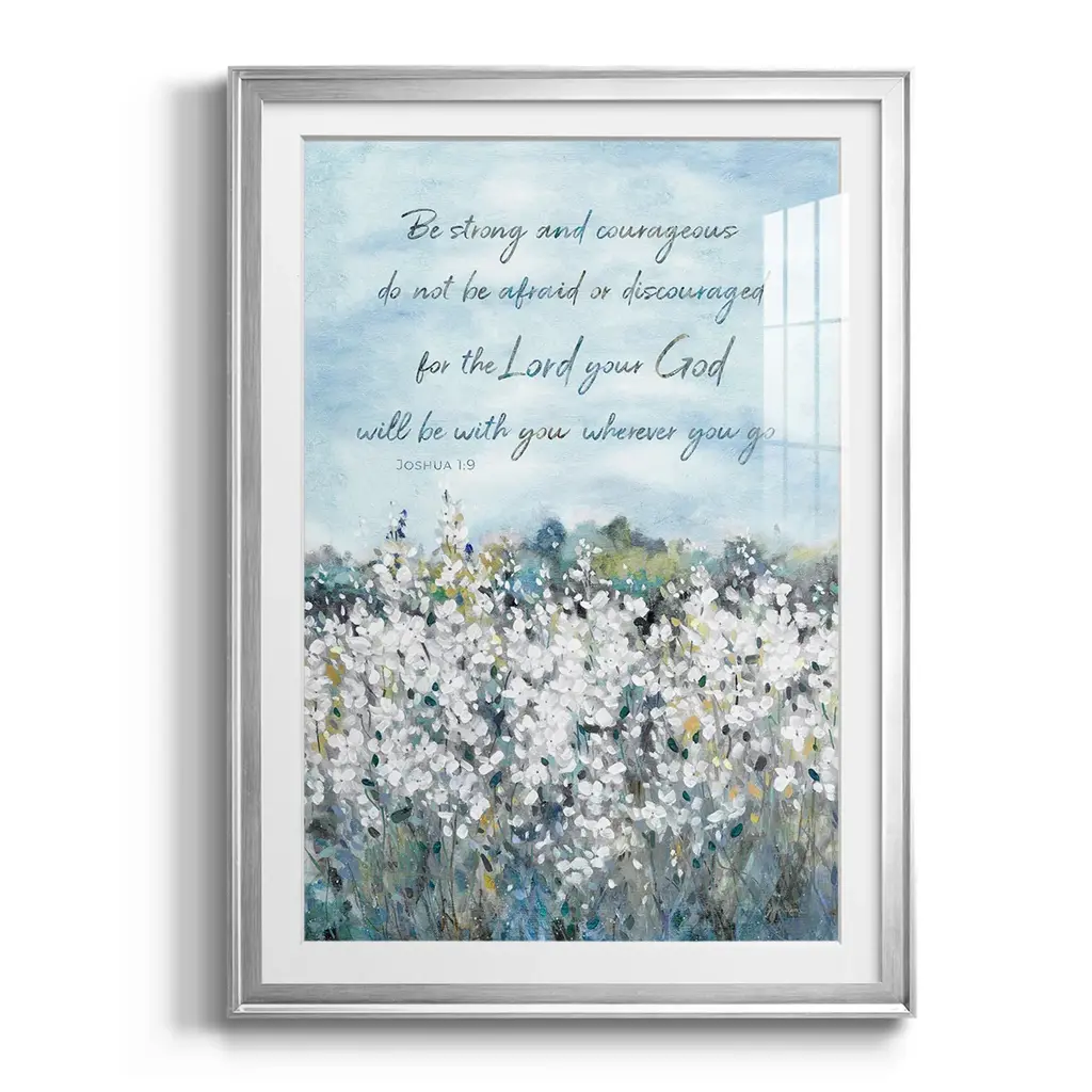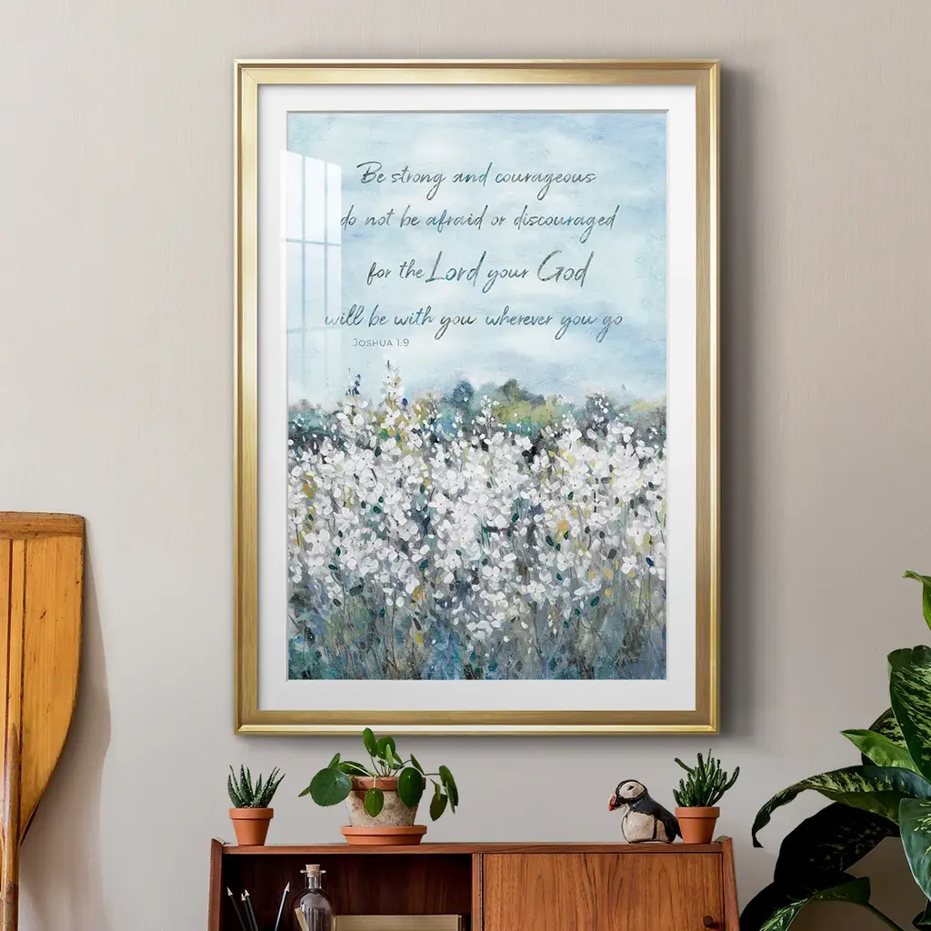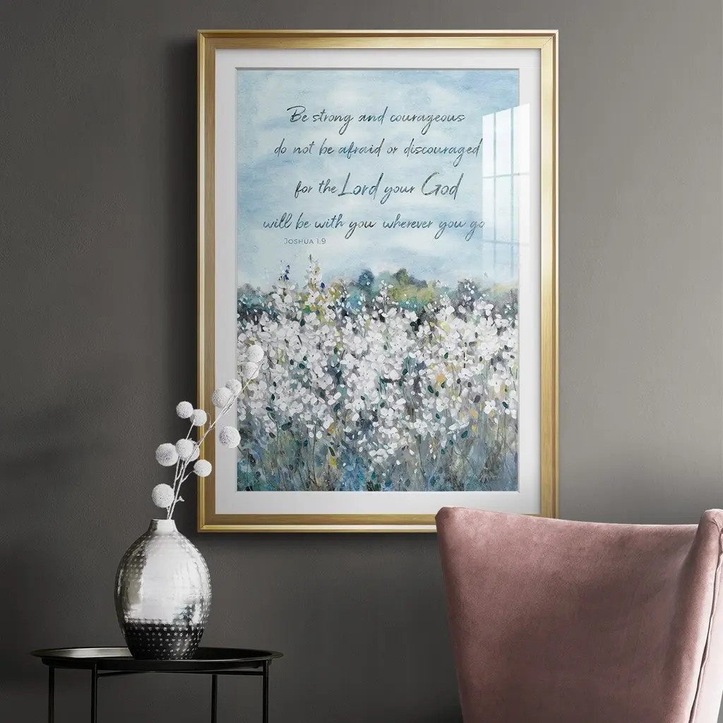 Be Strong Flower Field Premium Framed Print - Ready to Hang A Premium Framed Print created to last. Framed in distressed wood and available in an array of sizes and colors Featuring a beveled a solid wood stretcher bar, each piece comes ready to hand 4 SIZES AVAILABLE 30.5''X42.5'' - Overall Size 26.5'X36.5'' - Overall Size 22.5''x30.5'' - Overall Size 18.5''x24.5'' - Overall Size Each piece is made to order. Each piece comes with hanging hardware. Made in the USA Ready to Hang Giclee Paper Print Acrylic Glass Beveled Matt Board