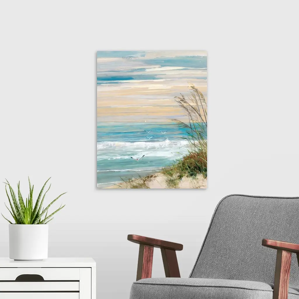 Contemporary painting of a beach scene with crashing ocean waves, beach grass blowing in the wind, flying seabirds, and an abstract sunset.