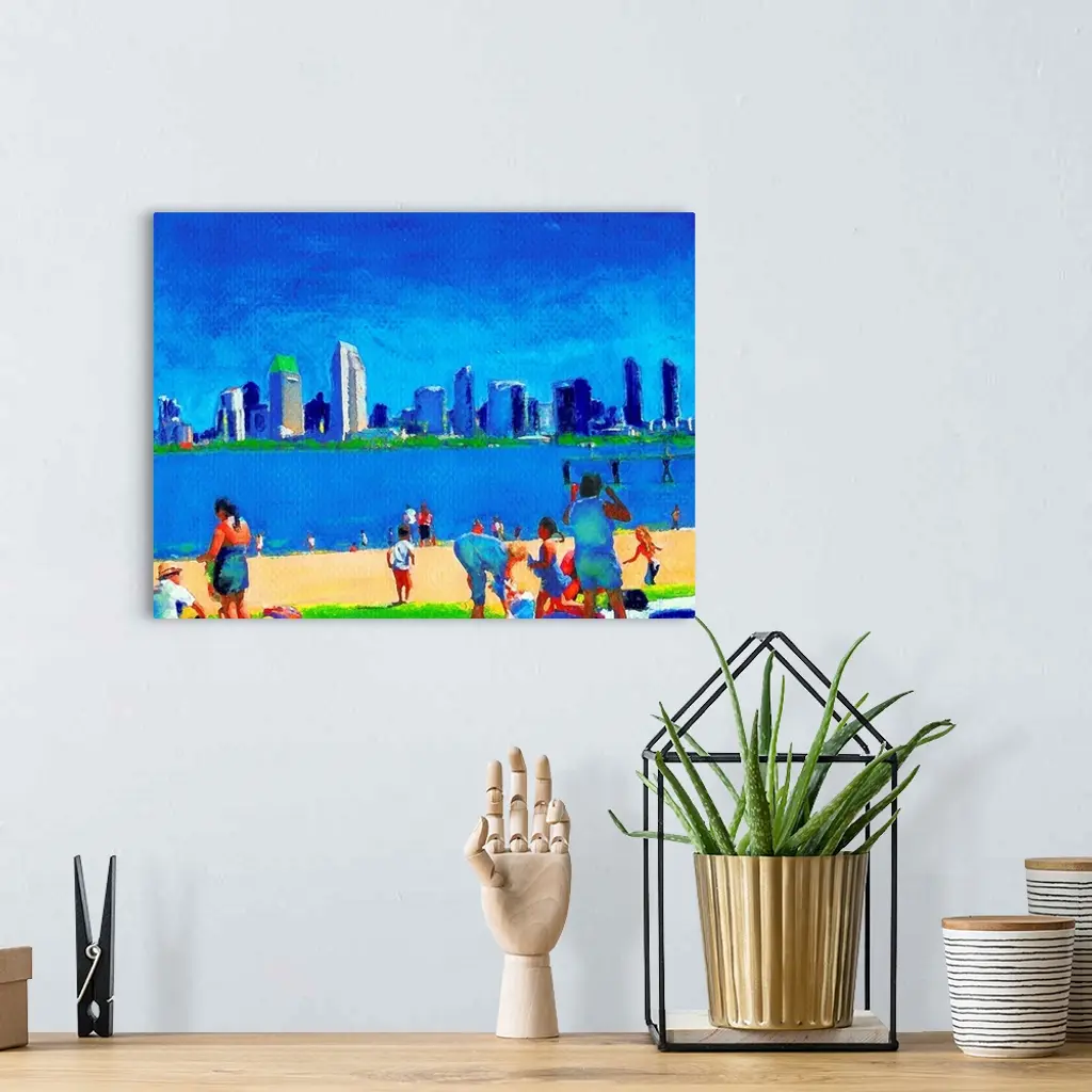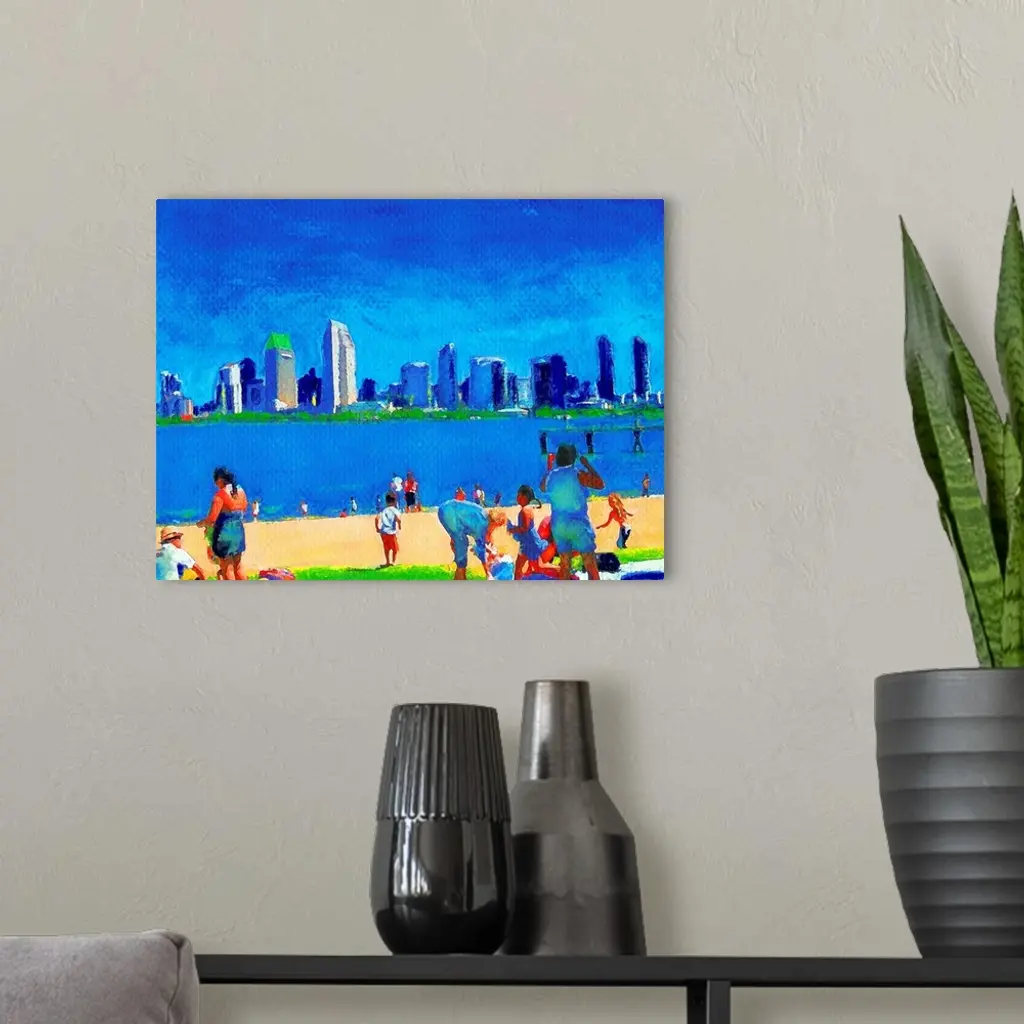 Watercolor painting of one of the best city views from the beach at the Ferry Landing on Coronado Island just across the bay from San Diego California.