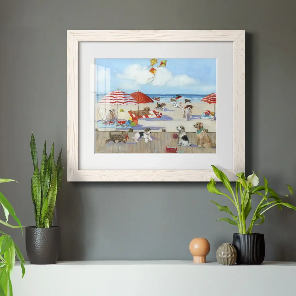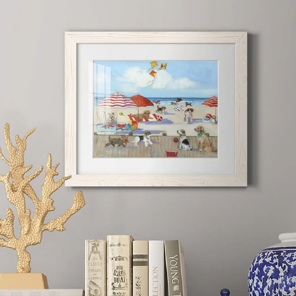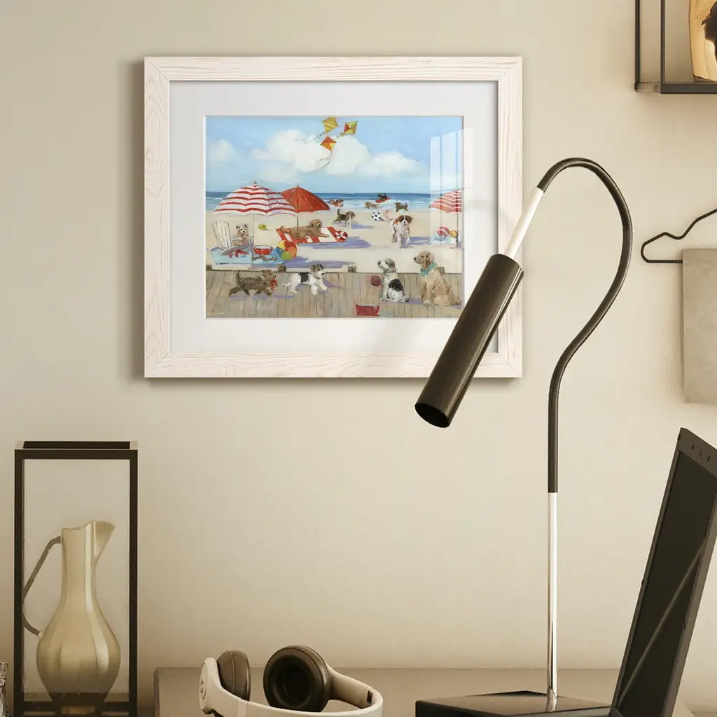 Beach Bark Park II-Premium Framed Print - Ready to Hang Framed in distressed wood and available in an array of sizes and colors Each piece is joined and assembled by hand and comes ready to hang 2 INCH BEVELED MATTE BOARD PLEXIGLASS COVERING READY TO HANG MADE IN THE USA SOLID WOOD FRAME MADE IN USA FADE RESISTANT GICLEE PRINTING on Canvas or Paper