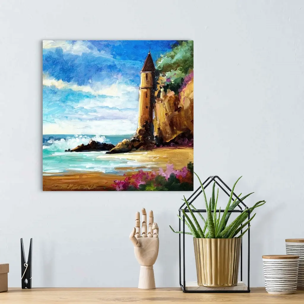 Watercolor painting of a castle on the shore in Laguna Beach, California.