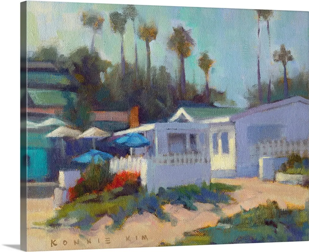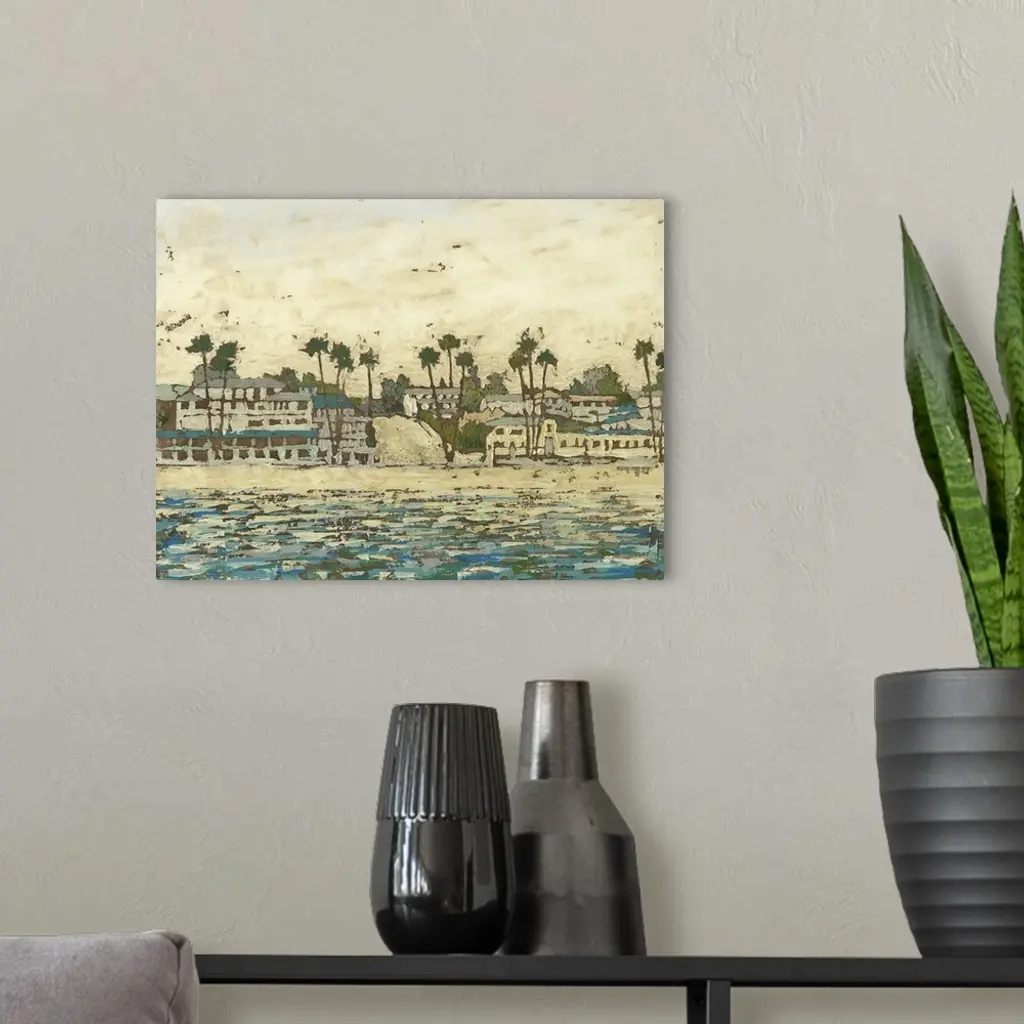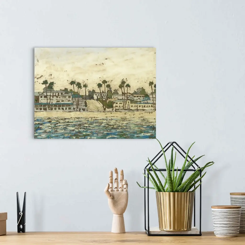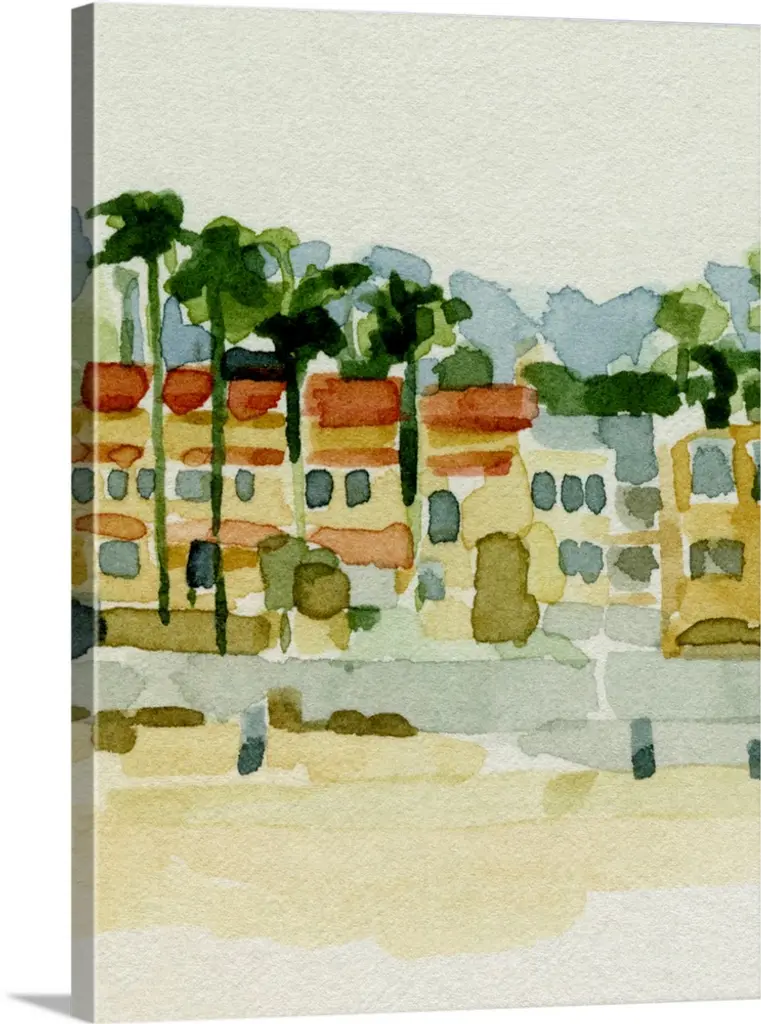 Contemporary painting of a seaside town with lots of palm trees.