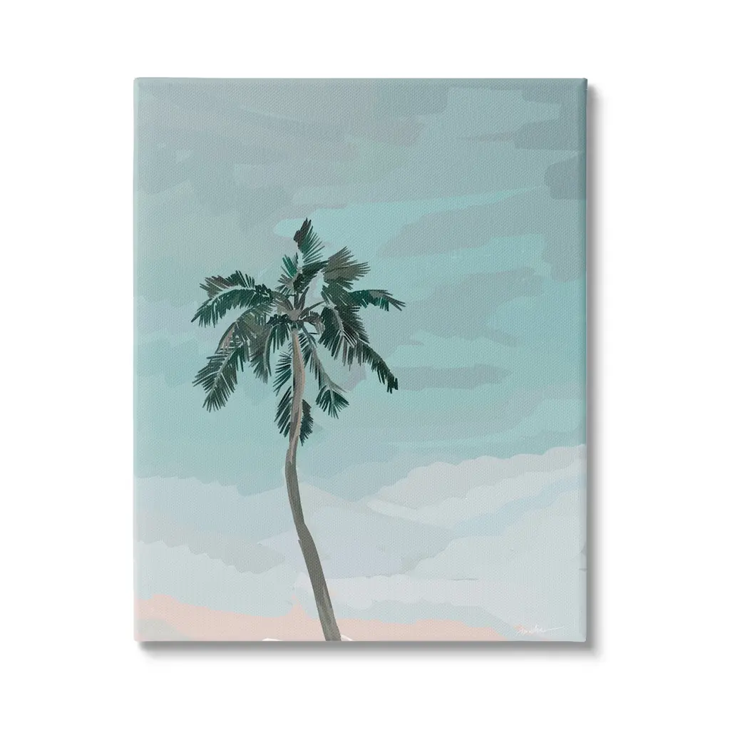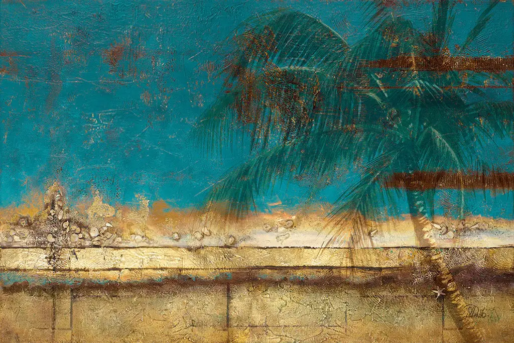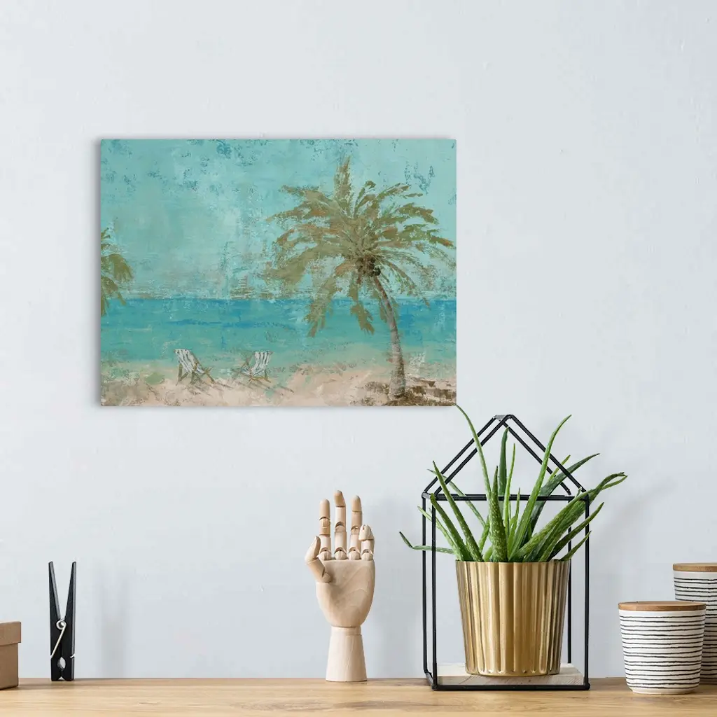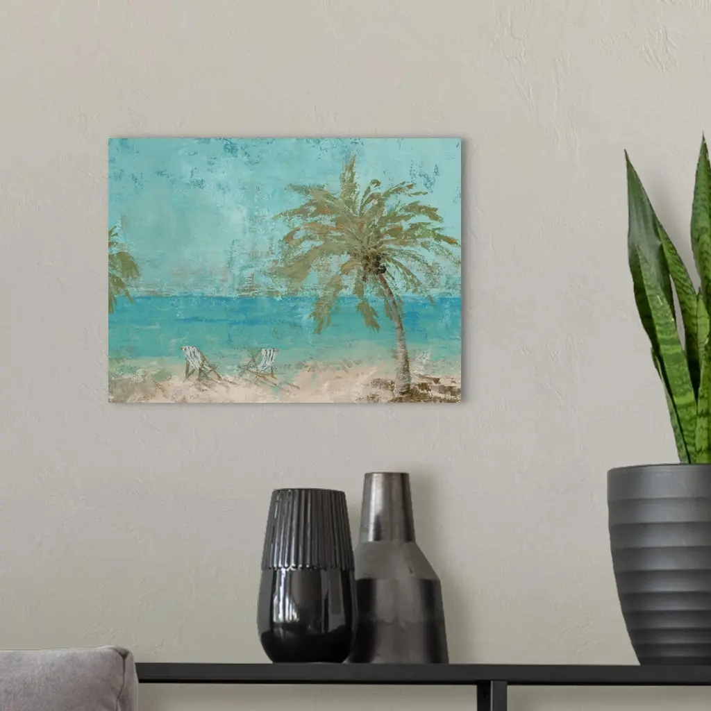 A contemporary painting of lawn chairs next to palm trees on a beach with teal blue water.