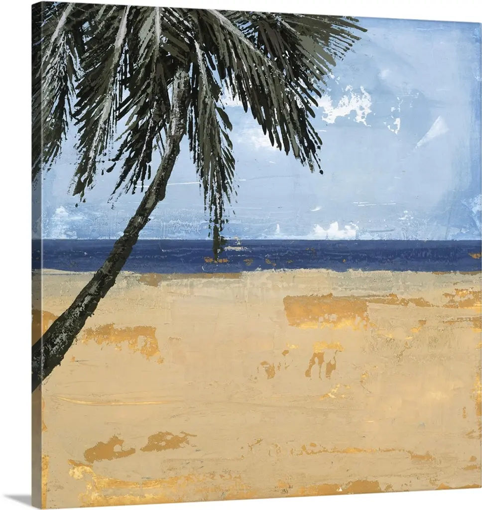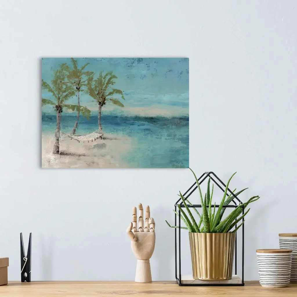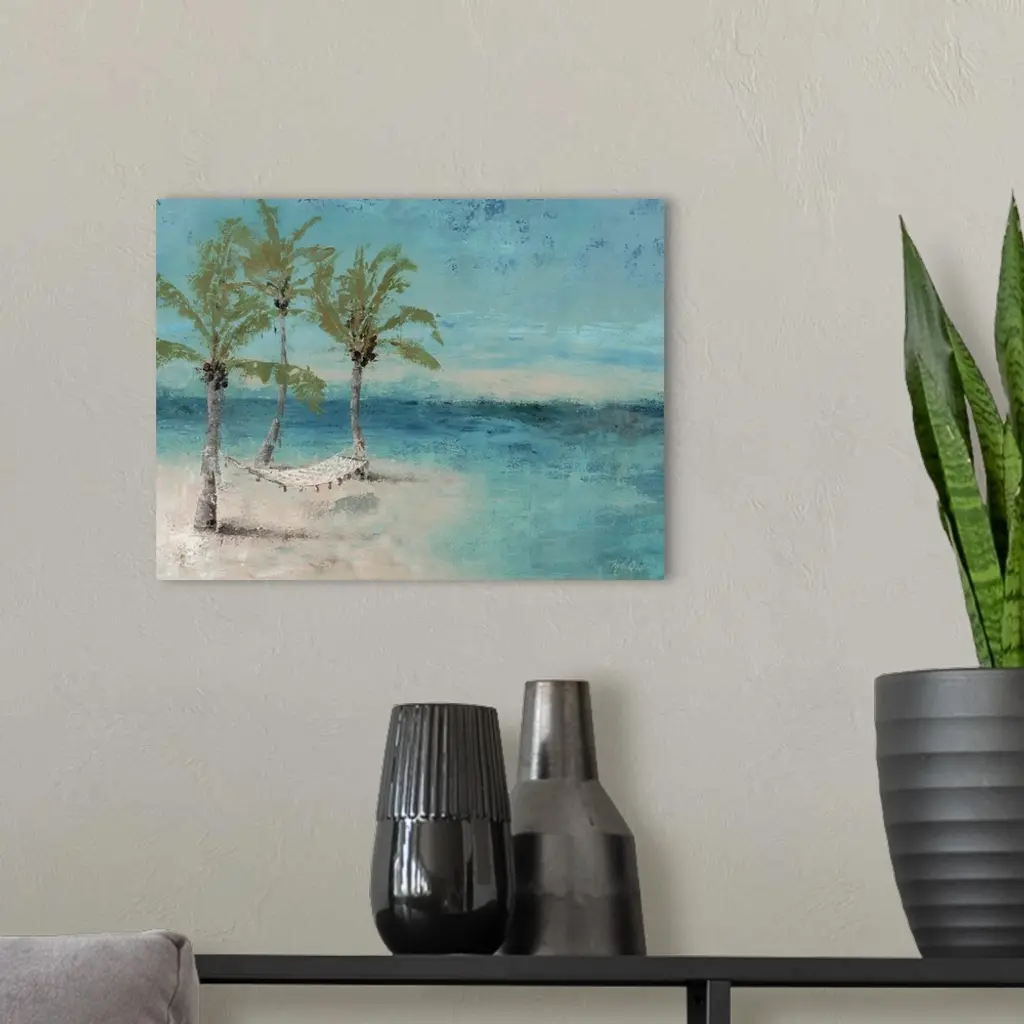 A contemporary painting of a hammock tied to palm trees on a beach with teal blue water.