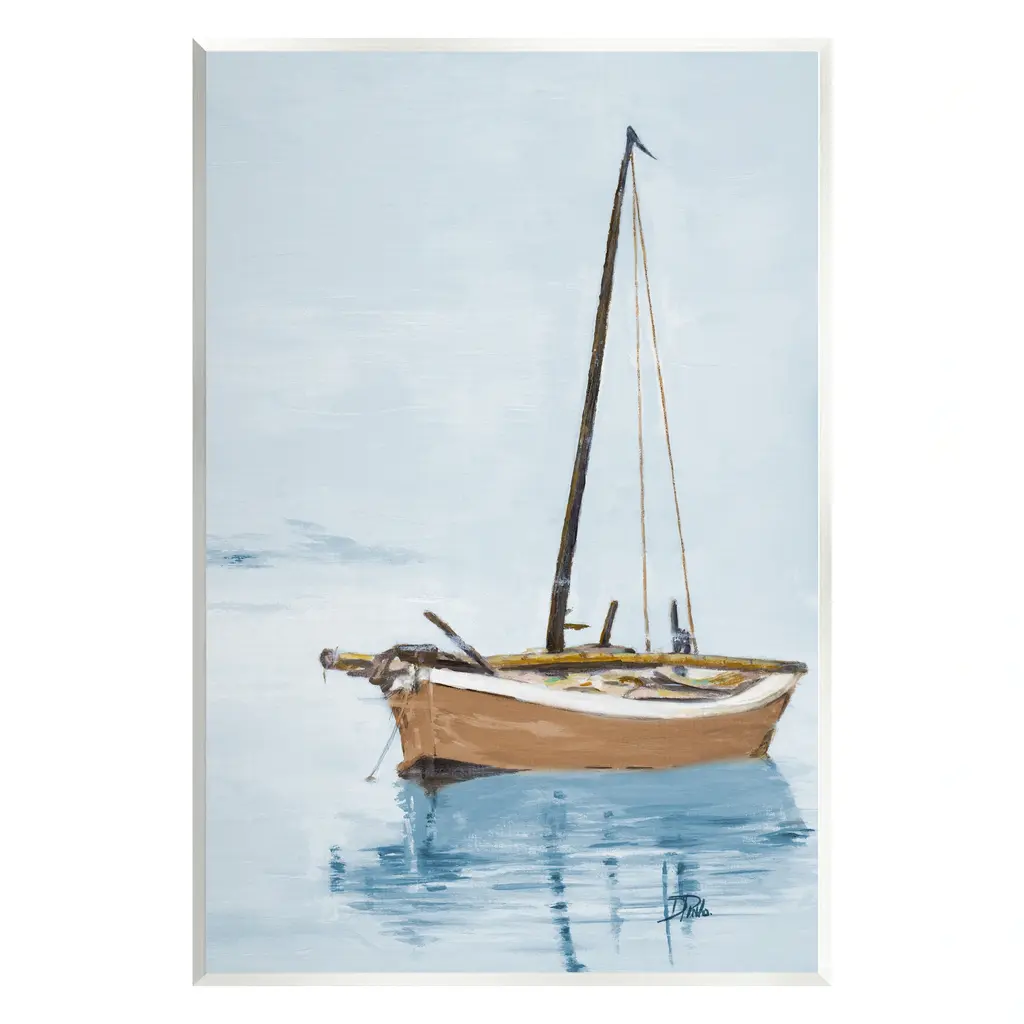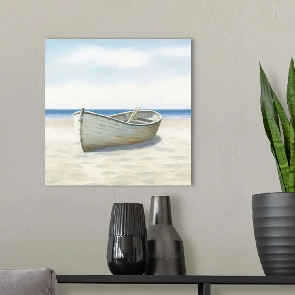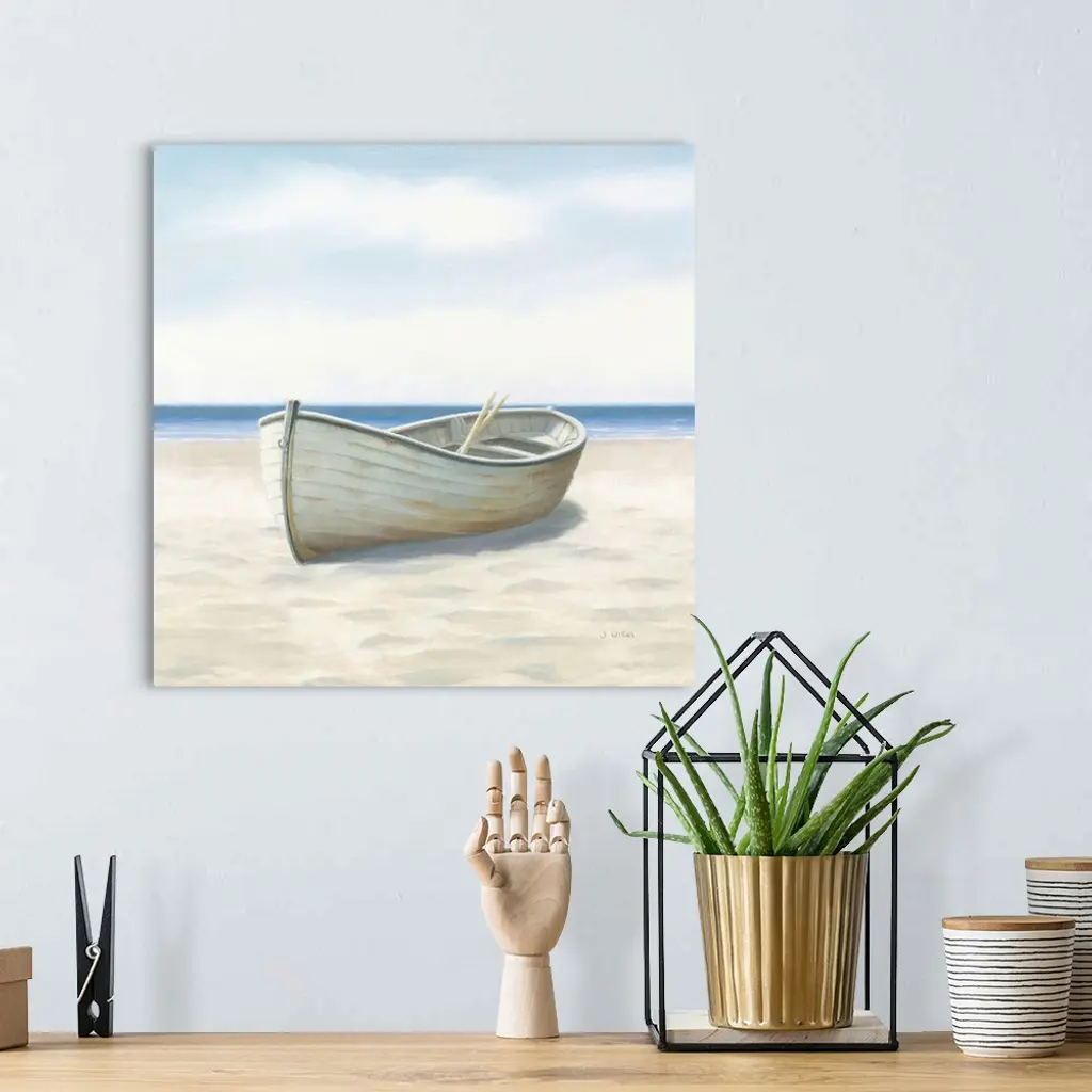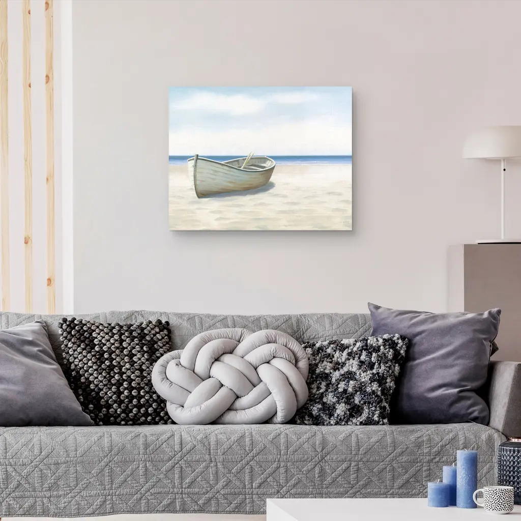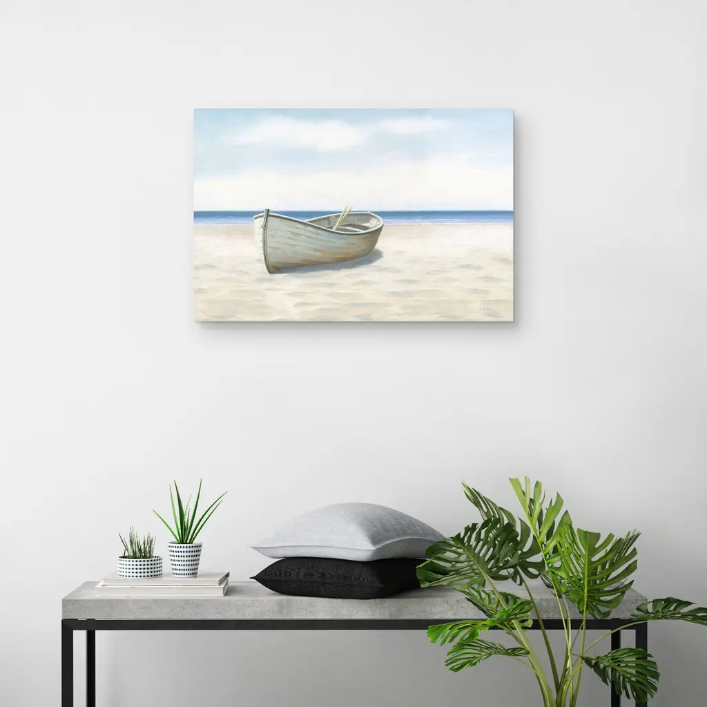 Contemporary painting of a white boat with oars inside, on the sandy beach with the ocean in the background.