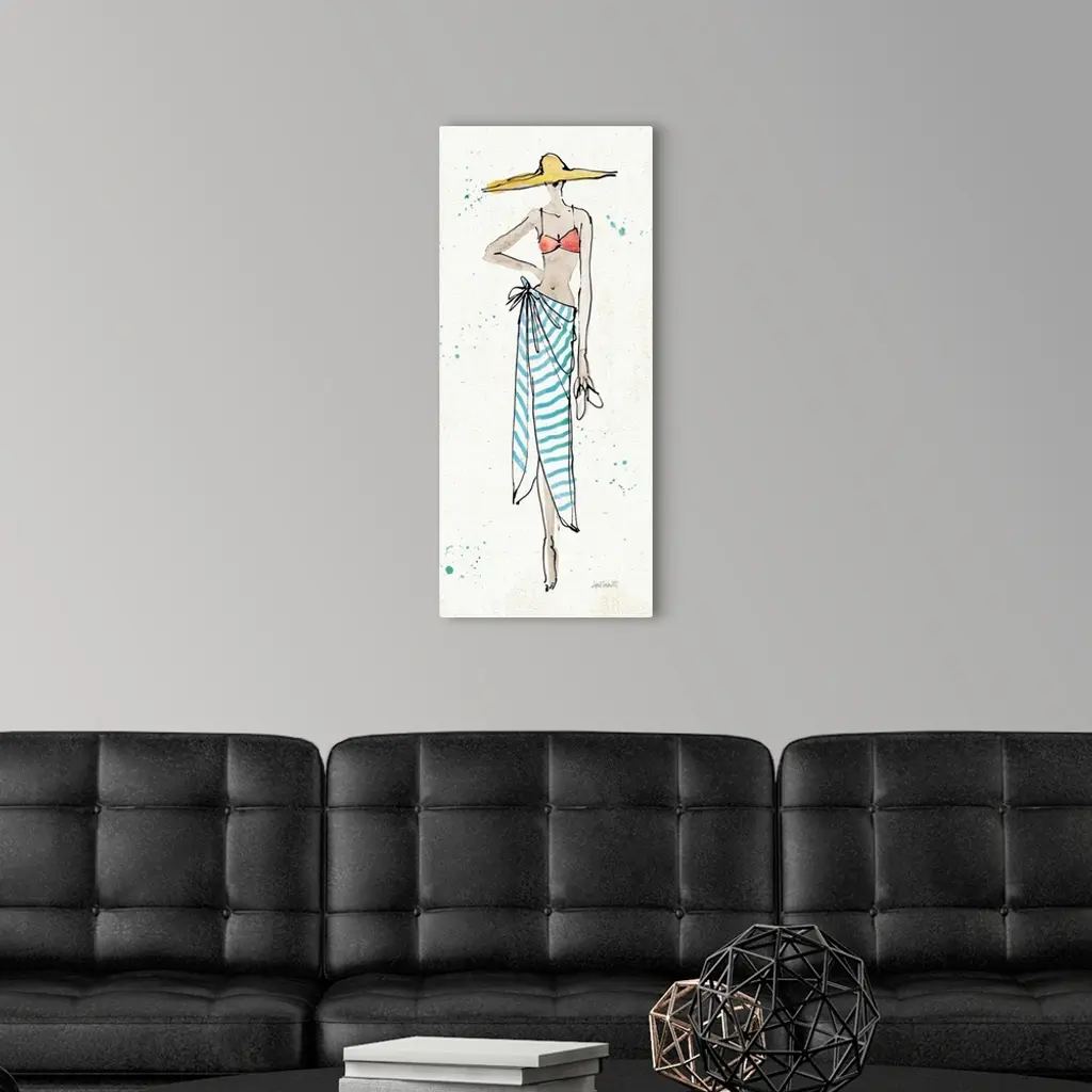 Contemporary fashion sketch of a woman wearing beach attire.