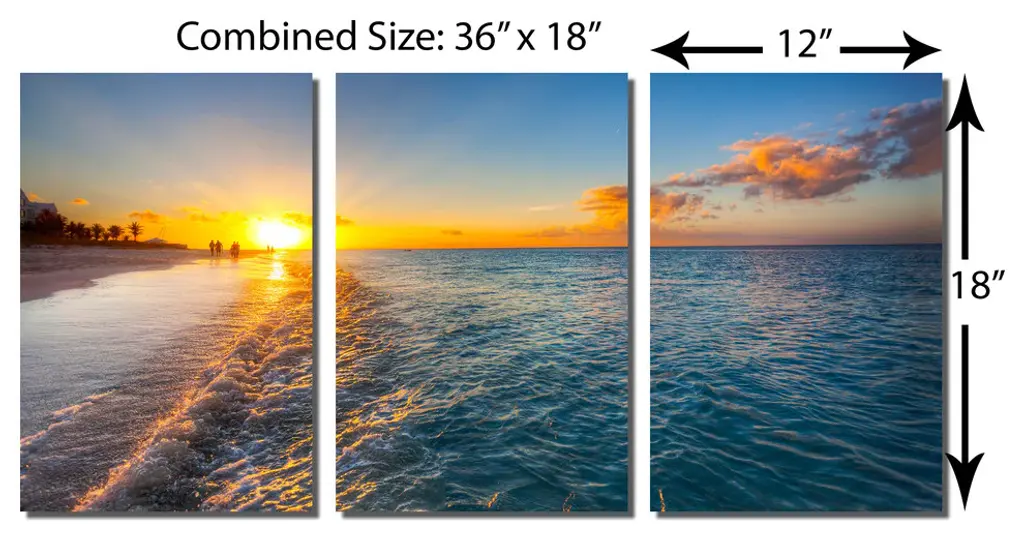 36"œ x 18"œ total size. Ready To Hang! (3 pieces - 12"œ x 18"œ each). Metal Print of a beautiful beach during Sunset. Modern metal wall art for home or office wall decor & interior design. Printed on Luxurious, HD aluminum glossy metal panels.. HD aluminum panels. Metal print wall art. Includes Shadow Wall Mount on the back.• Aluminum Metal Wall Art• Made in USA• Ready to hang - No assembly required• Shadow mount hardware on the back• 0.045"œ thick HD Aluminum Panels• Scratch resistant, glossy finish• Superb color clarity, luxurious prints• Epson printing process• For indoor or moisture rich environment use• Easy to clean. Gently wipe with microfiber cloth.