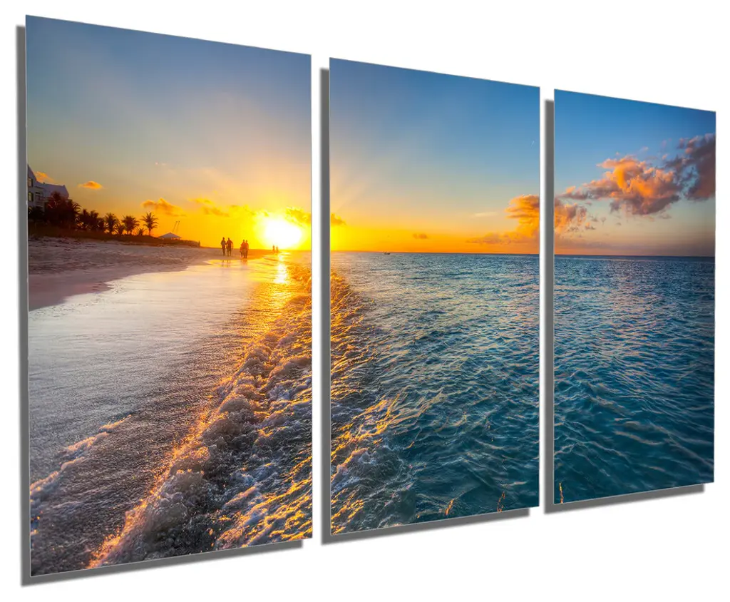 72"œ x 36"œ total size. Ready To Hang! (3 pieces - 24"œ x 36"œ each). Metal Print of a beautiful beach during Sunset. Modern metal wall art for home or office wall decor & interior design. Printed on Luxurious, HD aluminum glossy metal panels.. HD aluminum panels. Metal print wall art. Includes Shadow Wall Mount on the back.• Aluminum Metal Wall Art• Made in USA• Ready to hang - No assembly required• Shadow mount hardware on the back• 0.045"œ thick HD Aluminum Panels• Scratch resistant, glossy finish• Superb color clarity, luxurious prints• Epson printing process• For indoor or moisture rich environment use• Easy to clean. Gently wipe with microfiber cloth.